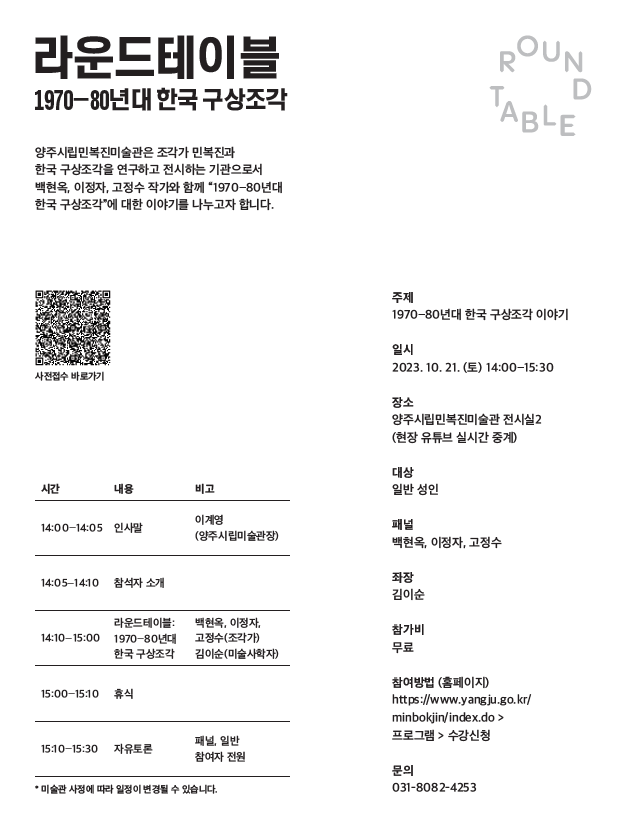 외부공지 행사 「라운드테이블: 1970-80년대 한국 구상조각」 안내 2023.10.12 조회수 4,095 학생처 share facebook twitter kakaotalk 카카오톡 앱이설치된 모바일 기기에서만공유 가능합니다. https://www.syu.ac.kr/?p=185660 share 복사 facebook twitter kakaotalk 카카오톡 앱이설치된 모바일 기기에서만공유 가능합니다. 이전글 구인2023 북부종합사회복지관 축제 자원봉사자 모집 안내 다음글 경진대회2023년 국립중앙과학관 3D 프린팅 설계데이터 활용 경진대회 안내 목록