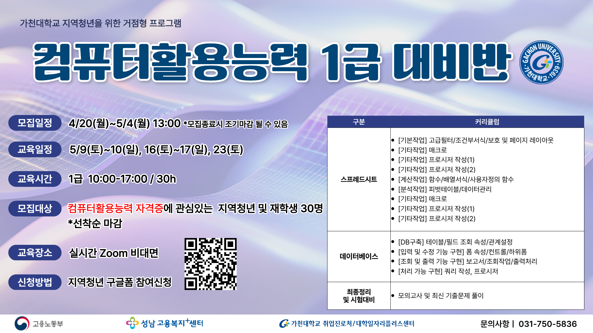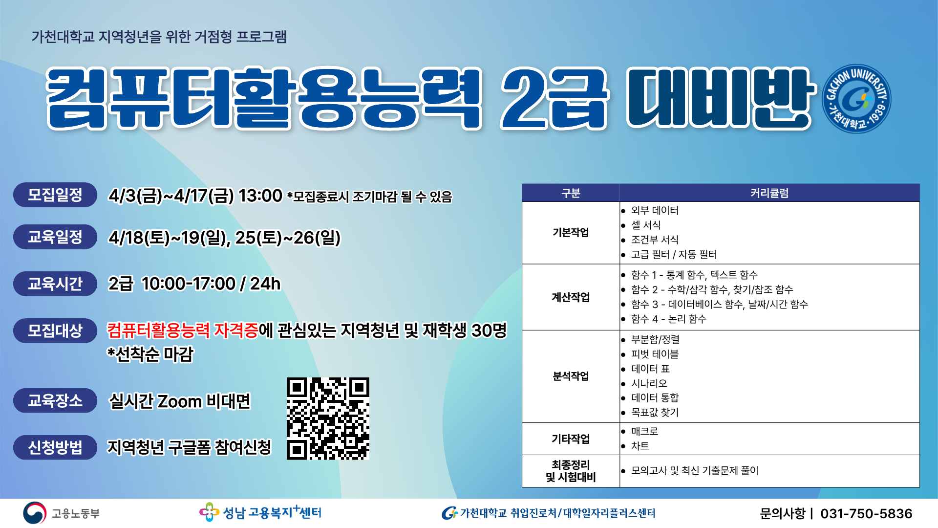 외부공지 [가천대학교] 프로그램 : IT – 컴퓨터 활용능력 1,2급 자격대비반 특강 (4,5월) 2026.04.06 조회수 641 취업지원팀 share facebook twitter kakaotalk 카카오톡 앱이설치된 모바일 기기에서만공유 가능합니다. https://www.syu.ac.kr/ydam share 복사 잘못된 파일 정보입니다. facebook twitter kakaotalk 카카오톡 앱이설치된 모바일 기기에서만공유 가능합니다. 이전글 [경주시] 2026년 2회(재공고) 경주시 지방임기제공무원 임용시험 다음글 서울특별시 어울림플라자 시간제 인력 채용공고 목록