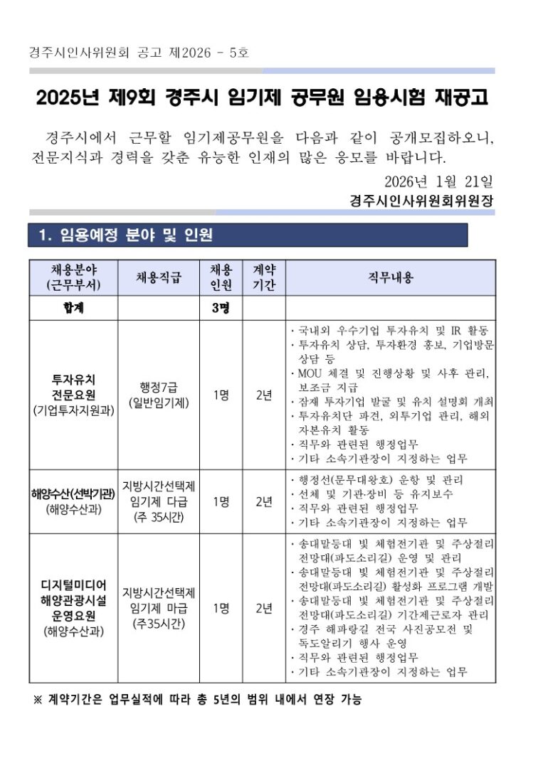 외부공지 [경주시]2025년 제9회(재공고) 경주시 지방임기제공무원 임용시험 안내 2026.01.22 조회수 16 취업지원팀 share facebook twitter kakaotalk 카카오톡 앱이설치된 모바일 기기에서만공유 가능합니다. https://www.syu.ac.kr/8lc5 share 복사 [경주시]2025년 제9회(재공고) 경주시 지방임기제공무원 임용시험 안내 2025년-제9회-임기제공무원-임용시험재공고.pdf (800.6 KB) 제9회-응시원서서식.hwp (68.0 KB) facebook twitter kakaotalk 카카오톡 앱이설치된 모바일 기기에서만공유 가능합니다. 이전글 [서울지방고용노동청서울북부지청]취업지원서비스 자료 제공 안내(1주 4주) 다음글 [차세대융합기술연구원]차세대융합기술연구원 채용공고 안내 목록