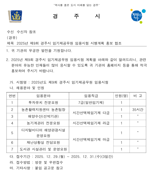 외부공지 [경주시]2025년 제9회 경주시 임기제공무원 임용시험 시행계획 안내 2025.12.30 조회수 236 취업지원팀 share facebook twitter kakaotalk 카카오톡 앱이설치된 모바일 기기에서만공유 가능합니다. https://www.syu.ac.kr/ase6 share 복사 2025년-제9회-임기제공무원-채용계획공고문.pdf (833.2 KB) facebook twitter kakaotalk 카카오톡 앱이설치된 모바일 기기에서만공유 가능합니다. 이전글 [노원구선거관리위원회]제9회 전국동시지방선거 선거사무보조원 모집 안내 다음글 [한남대학교] 「기업 맞춤형 반도체 취업전략」 과정 홍보 안내 목록