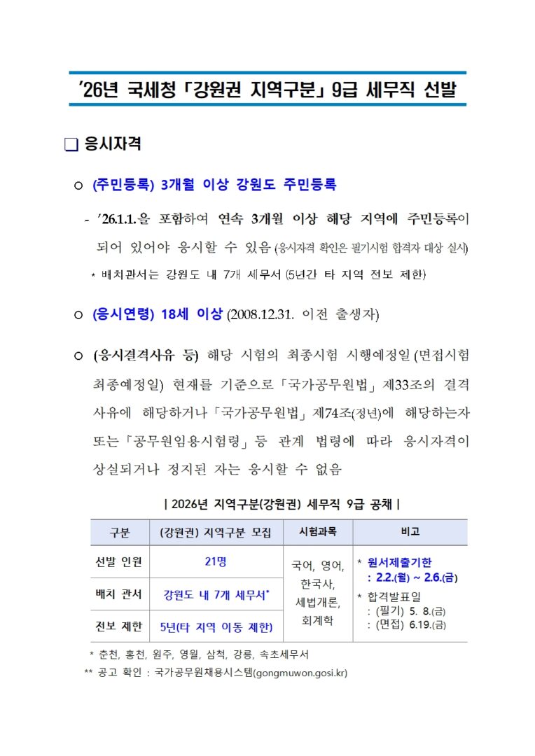 외부공지 [교육부]2026년도 세무직 「강원권 지역구분」 9급 공개경쟁채용시험 안내 2026.01.20 조회수 178 취업지원팀 share facebook twitter kakaotalk 카카오톡 앱이설치된 모바일 기기에서만공유 가능합니다. https://www.syu.ac.kr/7tr1 share 복사 국세청-강원권-지역구분-홍보자료.zip (20.4 MB) 잘못된 파일 정보입니다. facebook twitter kakaotalk 카카오톡 앱이설치된 모바일 기기에서만공유 가능합니다. 이전글 [(재)공주문화관광재단]2026년 (재)공주문화관광재단 제1회 직원 채용 홍보 안내 다음글 [한국장애인개발원]장애청년 채용 취업 정보 안내(1월 2차) 목록