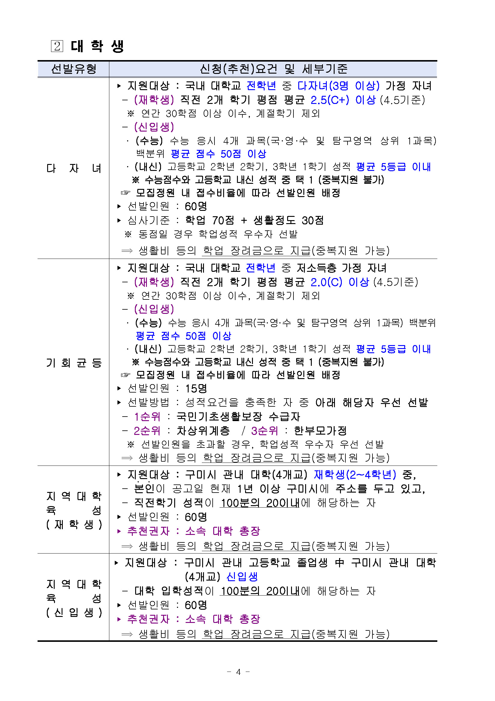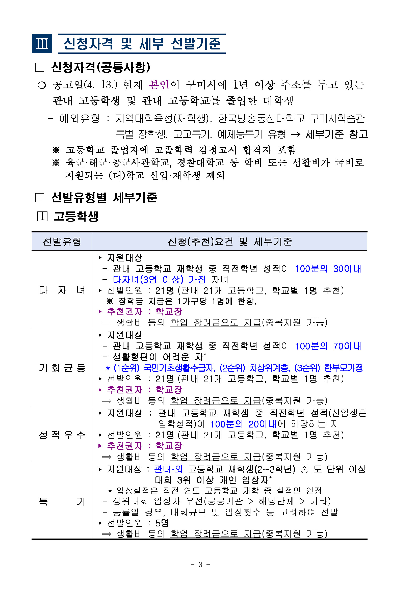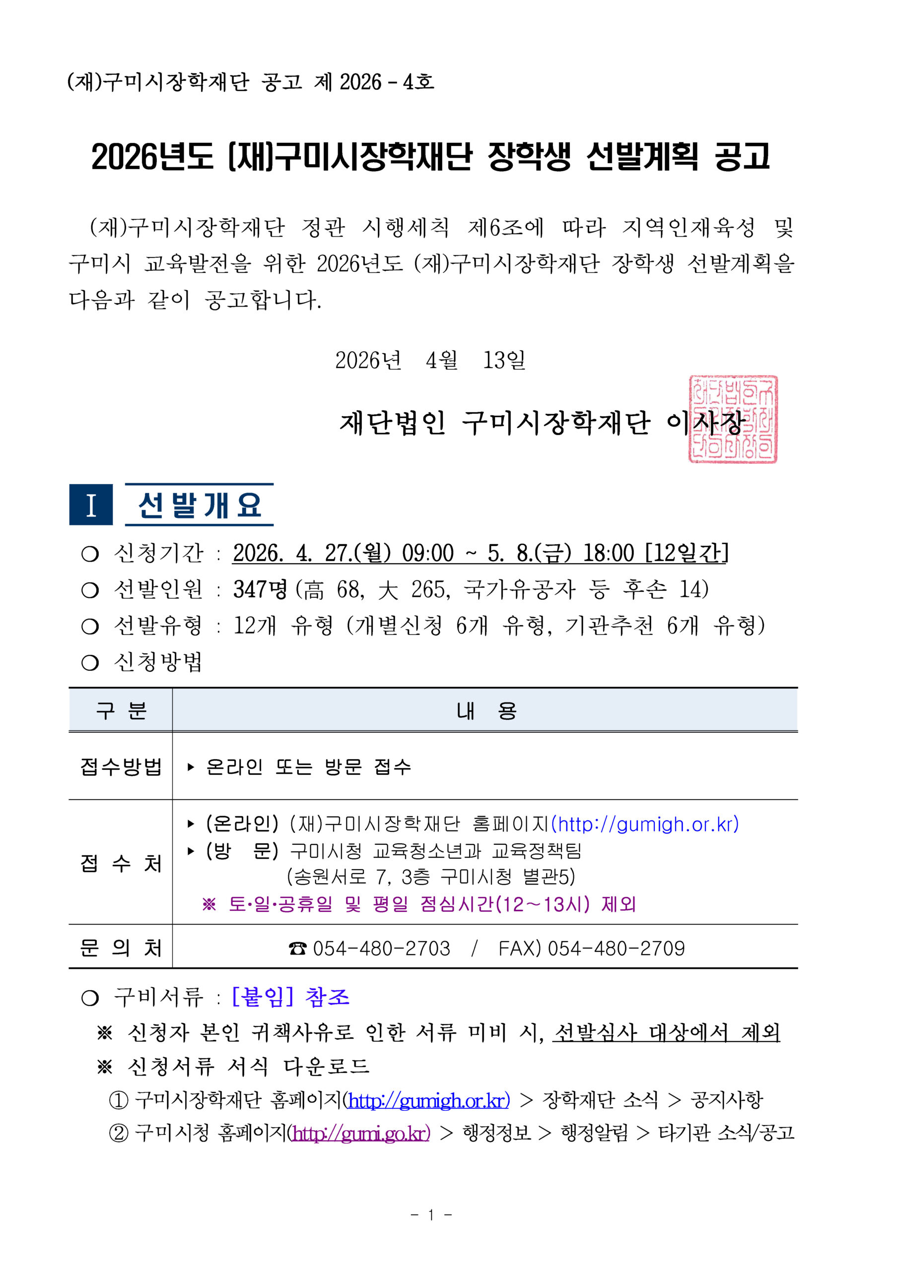 장학공지 [구미시] 2026년도 (재)구미시장학재단 장학생 선발 안내 2026.04.16 조회수 155 학생처 share facebook twitter kakaotalk 카카오톡 앱이설치된 모바일 기기에서만공유 가능합니다. https://www.syu.ac.kr/p8up share 복사 I 2026년도 (재)구미시장학재단 장학생 선발 안내 I 상세 내용은 아래 및 첨부파일을 확인하시어 반드시 해당 기관(단체)에 문의 혹은 홈페이지를 참고하시기 바랍니다. (아래의 그림을 클릭 시 해당 기관 홈페이지로 이동됩니다) 본문-2026년도-재구미시장학재단-장학생-선발-홍보-협조.pdf (186.9 KB) 서식-장학금-신청서류-2026.hwp (47.5 KB) facebook twitter kakaotalk 카카오톡 앱이설치된 모바일 기기에서만공유 가능합니다. 이전글 글이 없습니다. 다음글 2026-1학기 국가장학금 I유형 지급 안내_1차 목록