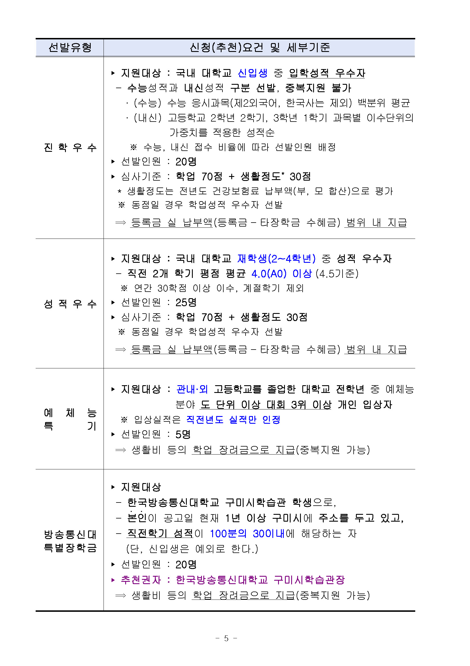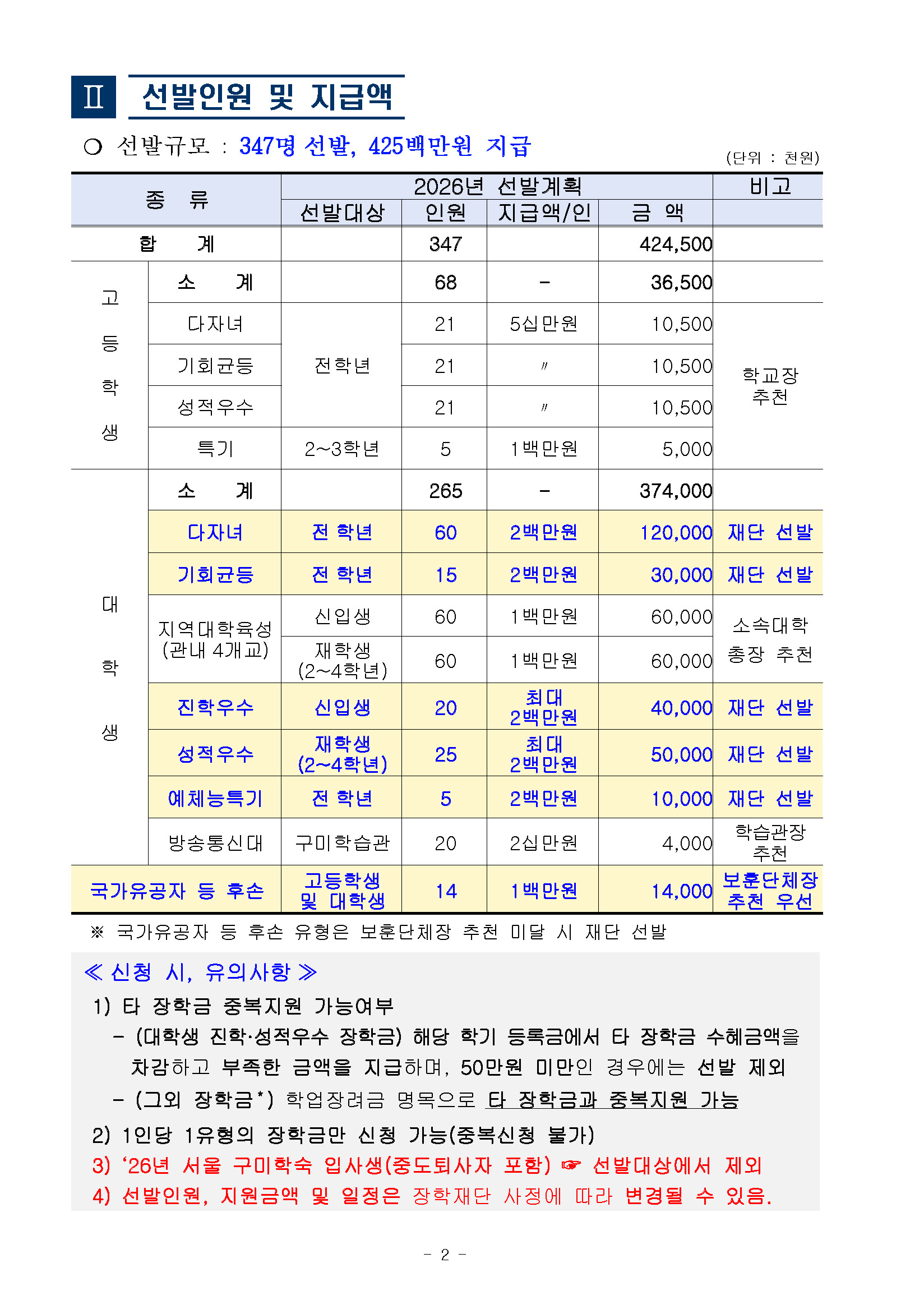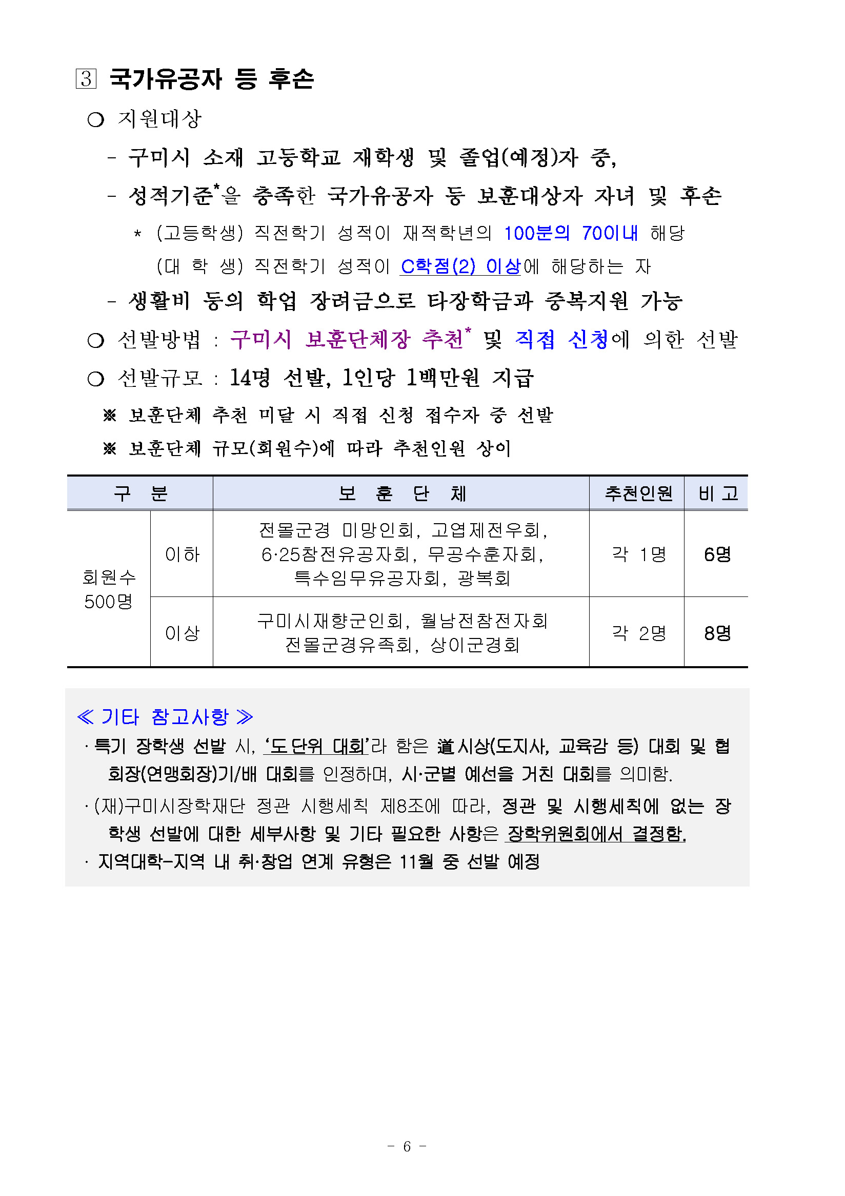 장학공지 [구미시] 2026년도 (재)구미시장학재단 장학생 선발 안내 2026.04.16 조회수 155 학생처 share facebook twitter kakaotalk 카카오톡 앱이설치된 모바일 기기에서만공유 가능합니다. https://www.syu.ac.kr/p8up share 복사 I 2026년도 (재)구미시장학재단 장학생 선발 안내 I 상세 내용은 아래 및 첨부파일을 확인하시어 반드시 해당 기관(단체)에 문의 혹은 홈페이지를 참고하시기 바랍니다. (아래의 그림을 클릭 시 해당 기관 홈페이지로 이동됩니다) 본문-2026년도-재구미시장학재단-장학생-선발-홍보-협조.pdf (186.9 KB) 서식-장학금-신청서류-2026.hwp (47.5 KB) facebook twitter kakaotalk 카카오톡 앱이설치된 모바일 기기에서만공유 가능합니다. 이전글 글이 없습니다. 다음글 2026-1학기 국가장학금 I유형 지급 안내_1차 목록