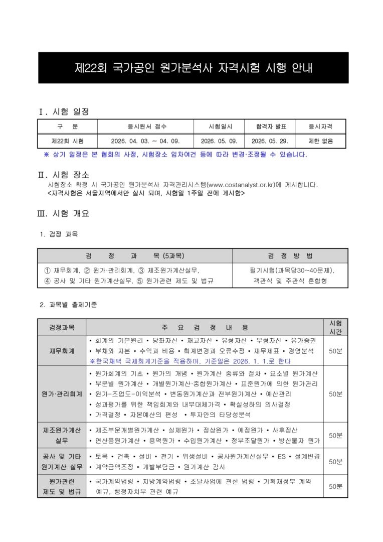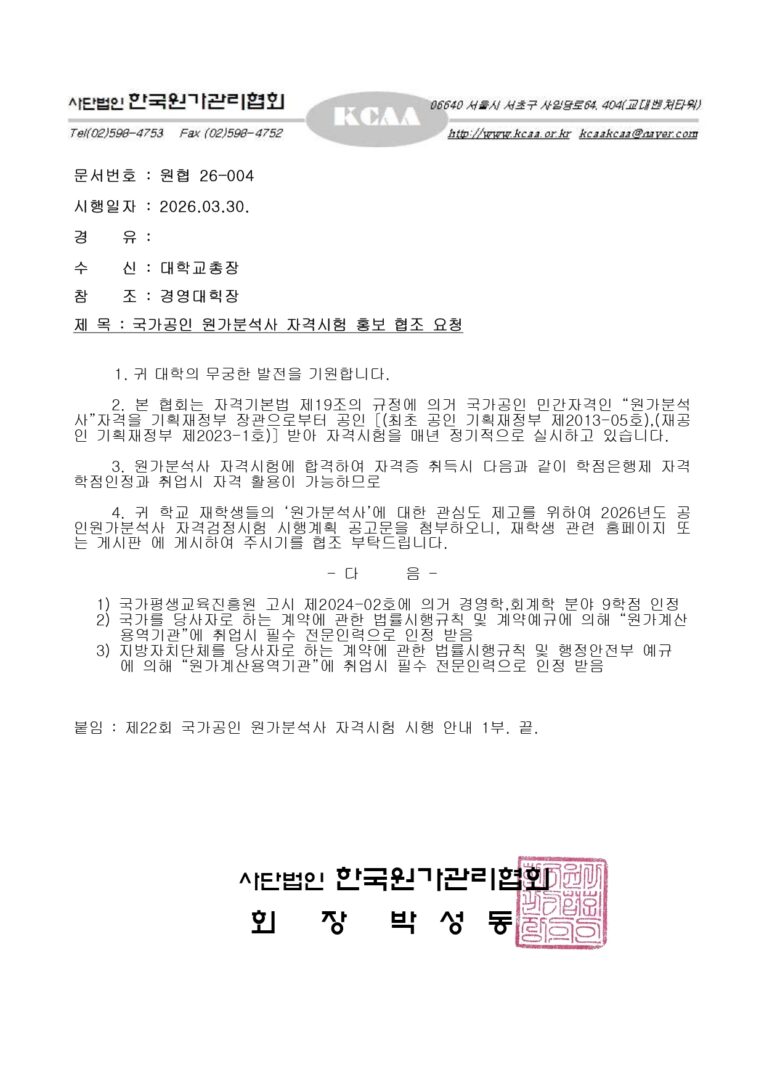 외부공지 국가공인 원가분석사 자격시험 홍보 2026.04.02 조회수 720 취업지원팀 share facebook twitter kakaotalk 카카오톡 앱이설치된 모바일 기기에서만공유 가능합니다. https://www.syu.ac.kr/mpdt share 복사 facebook twitter kakaotalk 카카오톡 앱이설치된 모바일 기기에서만공유 가능합니다. 이전글 미래에셋금융서비스 글로벌 금융인 양성과정 TAMS 16기 모집 안내 다음글 2026년 특수외국어능력평가(FLEX) 실시 안내 목록