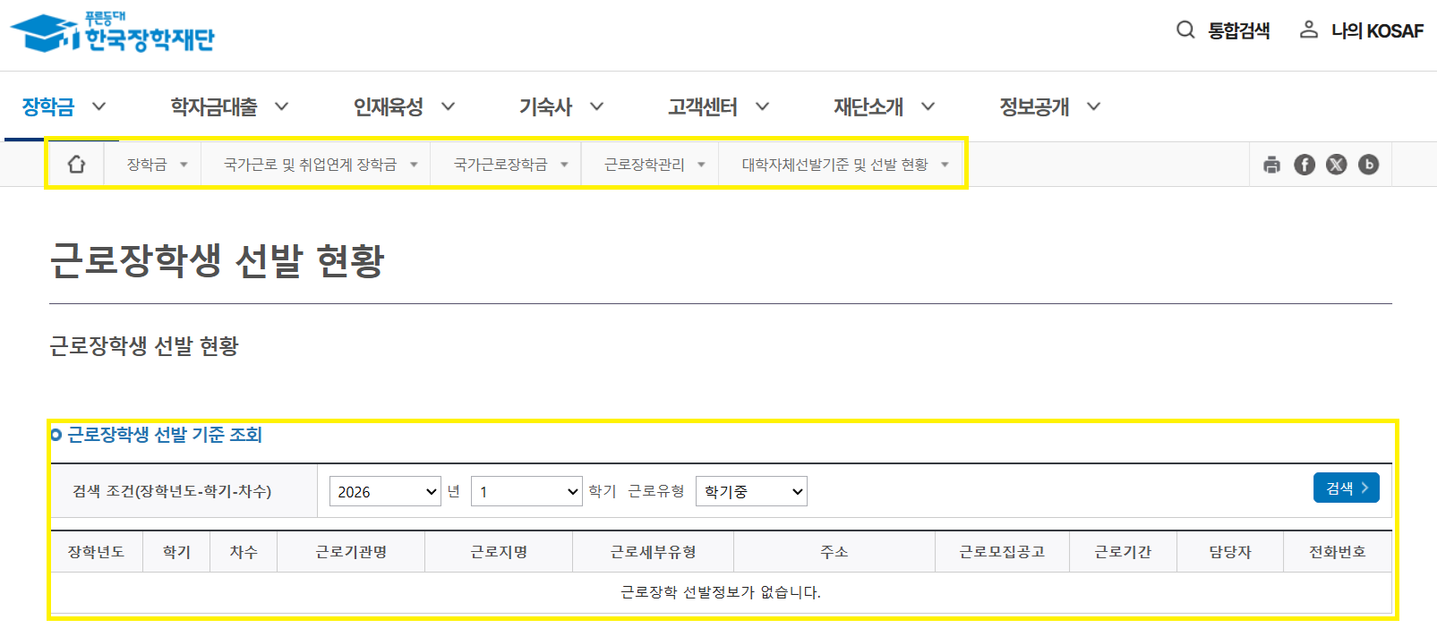※ 경로: 한국장학재단 홈페이지 접속 후 로그인 > 장학금 > 국가근로 및 취업연계 장학금 > 국가근로장학금 > 근로장학관리 > 대학자체선발기준 및 선발 현황