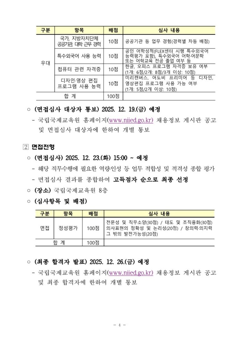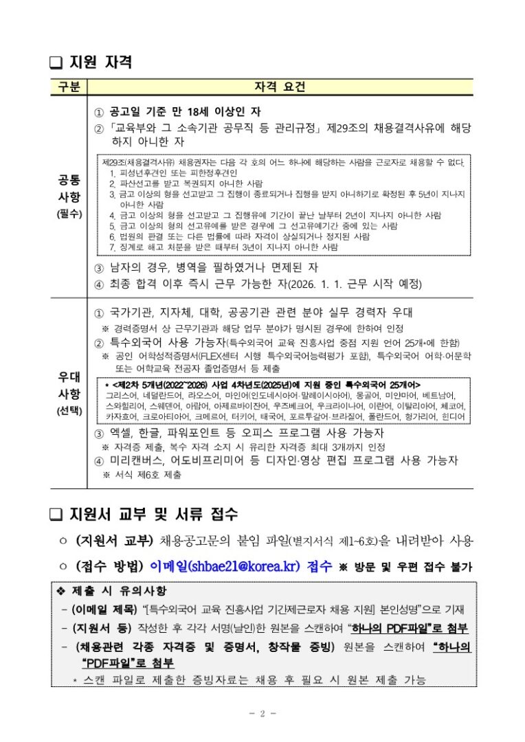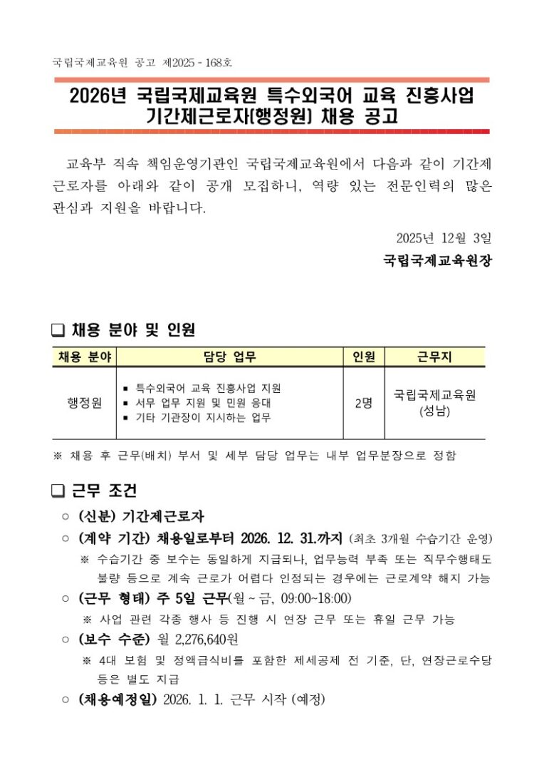외부공지 [국립국제교육원]2026년 국립국제교육원 특수외국어 교육 진흥사업 행정원(기간제 근로자) 채용 안내 2025.12.05 조회수 5,065 취업지원팀 share facebook twitter kakaotalk 카카오톡 앱이설치된 모바일 기기에서만공유 가능합니다. https://www.syu.ac.kr/y4gy share 복사 지원-서식-제16호.hwpx (80.5 KB) facebook twitter kakaotalk 카카오톡 앱이설치된 모바일 기기에서만공유 가능합니다. 이전글 [포항공과대학교]Apple 디벨로퍼 아카데미 5기 교육생 모집 안내 다음글 [차세대융합기술연구원]차세대융합기술연구원 채용공고 홍보 안내 목록