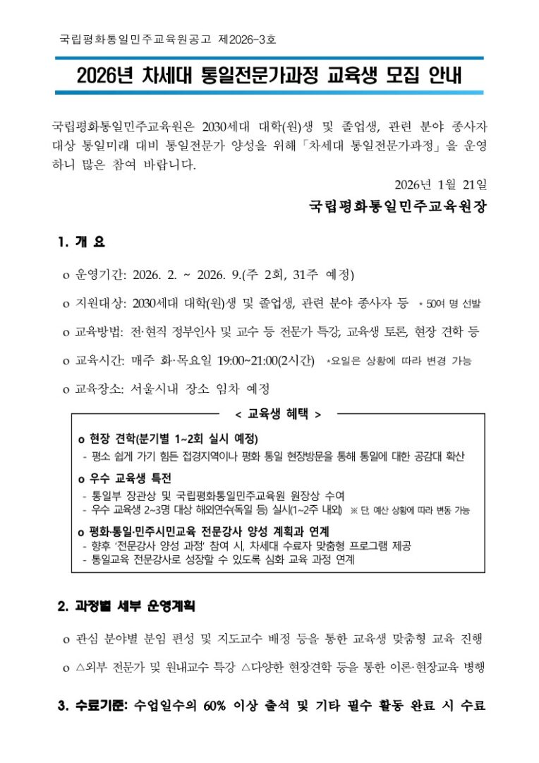 외부공지 [국립평화통일민주교육원]2026년 차세대 통일전문가과정 교육생 모집 안내 2026.01.20 조회수 184 취업지원팀 share facebook twitter kakaotalk 카카오톡 앱이설치된 모바일 기기에서만공유 가능합니다. https://www.syu.ac.kr/2em6 share 복사 2026년-차세대-통일전문가과정-교육생-모집-공고문.pdf (187.7 KB) 참고-2025년-차세대-통일전문가과정-교육-운영계획.pdf (1.9 MB) 2026년-차세대-통일전문가과정-신청서성함.hwpx (36.6 KB) 2026년-차세대-통일전문가과정-개인정보-수집-동의서.hwpx (50.6 KB) facebook twitter kakaotalk 카카오톡 앱이설치된 모바일 기기에서만공유 가능합니다. 이전글 [한국장애인개발원]장애청년 채용 취업 정보 안내(1월 2차) 다음글 [새만금개발청]새만금개발청 일반임기제 공무원(행정6급, 영상PD) 경력경쟁채용시험 안내 목록