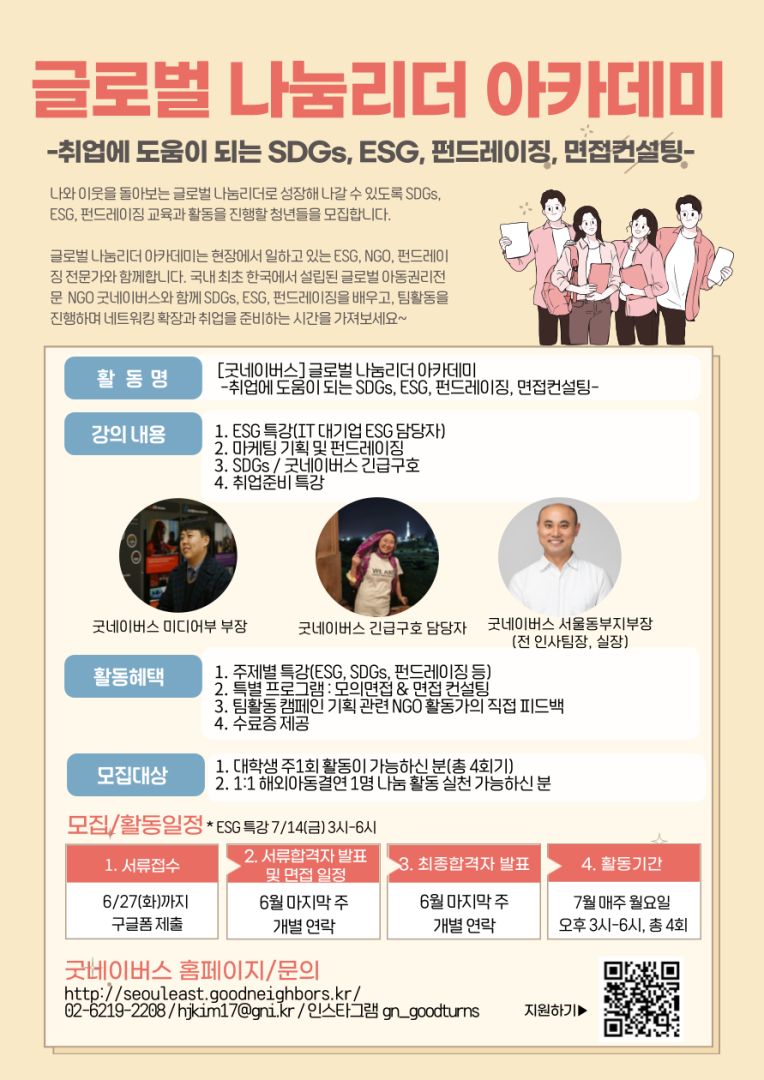 외부공지 일반 [굿네이버스 서울동부지부] 대학생 나눔리더 아카데미 모집 안내 2023.06.16 조회수 3,312 학생처 share facebook twitter kakaotalk 카카오톡 앱이설치된 모바일 기기에서만공유 가능합니다. https://www.syu.ac.kr/?p=147624 share 복사 첨부2.-글로벌-나눔리더-아카데미-안내.hwp (14.5 KB) facebook twitter kakaotalk 카카오톡 앱이설치된 모바일 기기에서만공유 가능합니다. 이전글 고양시자원봉사센터 그린가드 (청년 참여단) 모집 안내 다음글 행사2023년 영광법성포단오제 행사일정 안내 목록