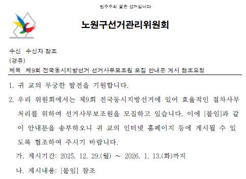 외부공지 [노원구선거관리위원회]제9회 전국동시지방선거 선거사무보조원 모집 안내 2025.12.30 조회수 278 취업지원팀 share facebook twitter kakaotalk 카카오톡 앱이설치된 모바일 기기에서만공유 가능합니다. https://www.syu.ac.kr/5ez6 share 복사 별지14-응시원서-및-자기소개서-등서식.hwp (70.5 KB) 붙임선거사무보조원-모집-안내문.pdf (217.7 KB) facebook twitter kakaotalk 카카오톡 앱이설치된 모바일 기기에서만공유 가능합니다. 이전글 글이 없습니다. 다음글 [경주시]2025년 제9회 경주시 임기제공무원 임용시험 시행계획 안내 목록
