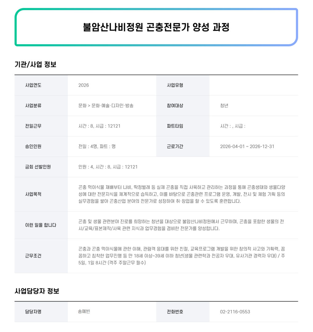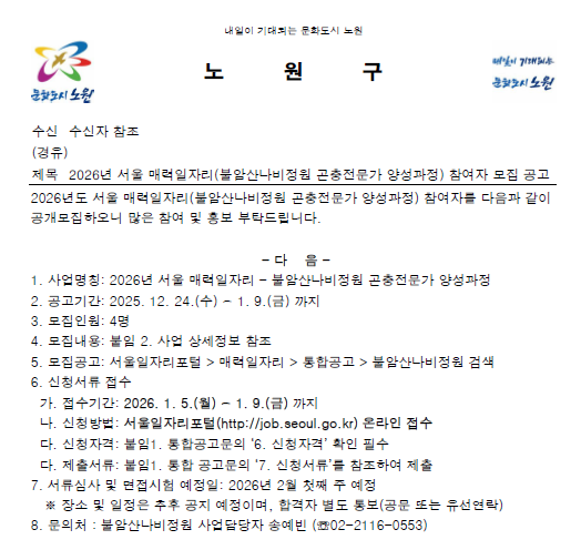 외부공지 [노원구청]2026년 서울 매력일자리(불암산나비정원 곤충전문가 양성과정) 참여자 모집 공고 2026.01.05 조회수 226 취업지원팀 share facebook twitter kakaotalk 카카오톡 앱이설치된 모바일 기기에서만공유 가능합니다. https://www.syu.ac.kr/8rte share 복사 1.-2026년-서울-매력일자리-참여자-모집-통합공고문.hwpx (72.1 KB) facebook twitter kakaotalk 카카오톡 앱이설치된 모바일 기기에서만공유 가능합니다. 이전글 [인제대학교]인제대학교 정규직 직원 신규채용 공고 안내 다음글 [산림청]산림청 임업직 국가공무원 경력경쟁채용시험 공고 안내 목록