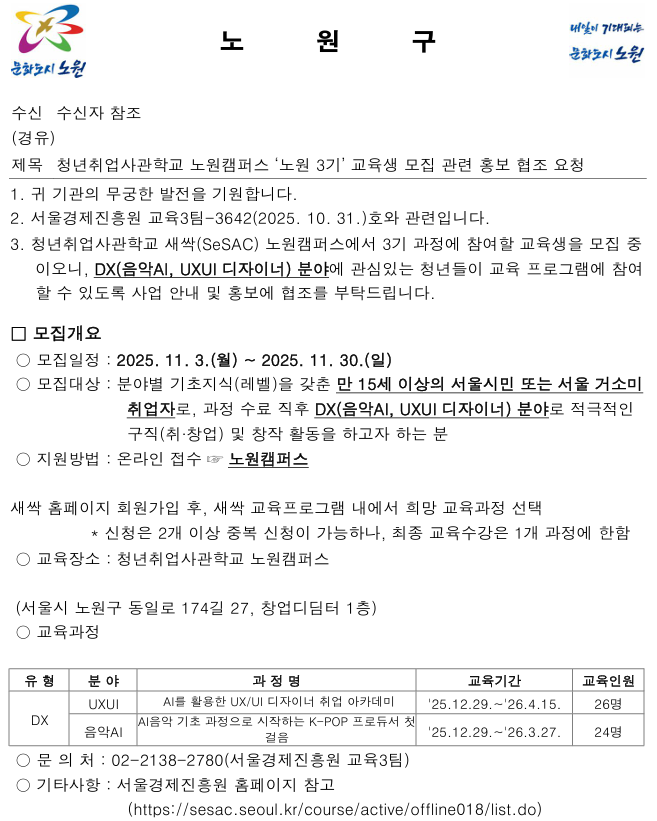 외부공지 [노원구] 청년취업사관학교 노원캠퍼스 ‘노원 3기’ 교육생 모집 안내 2025.11.05 조회수 36 취업지원팀 share facebook twitter kakaotalk 카카오톡 앱이설치된 모바일 기기에서만공유 가능합니다. https://www.syu.ac.kr/3bub share 복사 facebook twitter kakaotalk 카카오톡 앱이설치된 모바일 기기에서만공유 가능합니다. 이전글 [제주특별자치도개발공사]탐라영재관 직원 공개채용 안내 다음글 [차세대융합기술연구원]차세대융합기술연구원 채용공고 안내 목록