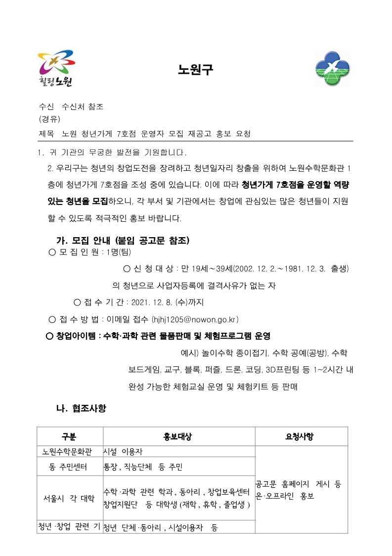 취업·창업공지 창업 노원 청년가게 7호점 운영자 모집 재공고 2021.12.08 조회수 4,399 취업지원팀 share facebook twitter kakaotalk 카카오톡 앱이설치된 모바일 기기에서만공유 가능합니다. https://www.syu.ac.kr/?p=111926 share 복사 재공고7호점-운영자모집-공고3.pdf (341.1 KB) 7호점-위치도-현장사진.pdf (1.2 MB) 7001793-삼육대학교-2021-10970.pdf (279.2 KB) facebook twitter kakaotalk 카카오톡 앱이설치된 모바일 기기에서만공유 가능합니다. 이전글 창업창업-Maker 3D프린팅 설계 프로그램 다음글 창업창업-Maker 2021 드론 기초 교육 (나만의 DIY 드론 메이커 프로그램 ) 목록