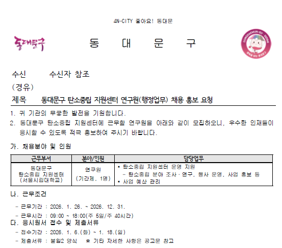 외부공지 [동대문구청]동대문구 탄소중립 지원센터 연구원(행정업무) 채용 안내 2026.01.13 조회수 1,697 취업지원팀 share facebook twitter kakaotalk 카카오톡 앱이설치된 모바일 기기에서만공유 가능합니다. https://www.syu.ac.kr/ootp share 복사 붙임1-동대문구-탄소중립지원센터-직원채용-공고문.pdf (81.9 KB) 붙임2-채용지원서.hwpx (47.4 KB) facebook twitter kakaotalk 카카오톡 앱이설치된 모바일 기기에서만공유 가능합니다. 이전글 글이 없습니다. 다음글 [성신여자대학교]2025학년도 JAVA 프로그래밍 입문 과정 교육생 모집 안내 목록