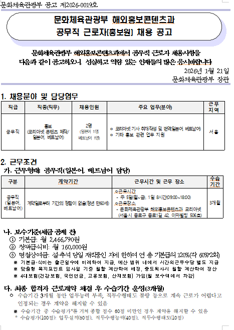 외부공지 [문화체육관광부]해외홍보콘텐츠과 공무직 근로자(홍보원) 채용 공고 안내 2026.01.21 조회수 18 취업지원팀 share facebook twitter kakaotalk 카카오톡 앱이설치된 모바일 기기에서만공유 가능합니다. https://www.syu.ac.kr/shml share 복사 해외홍보콘텐츠과-공무직홍보원-채용-공고.hwp (98.5 KB) facebook twitter kakaotalk 카카오톡 앱이설치된 모바일 기기에서만공유 가능합니다. 이전글 [인사혁신처]2026년도 국가공무원 9급 공개경쟁채용시험 원서접수관련 안내 다음글 [(재)대구문화예술진흥원]2026 대구오페라하우스 오펀스튜디오 오디션 참가자 모집 안내 목록