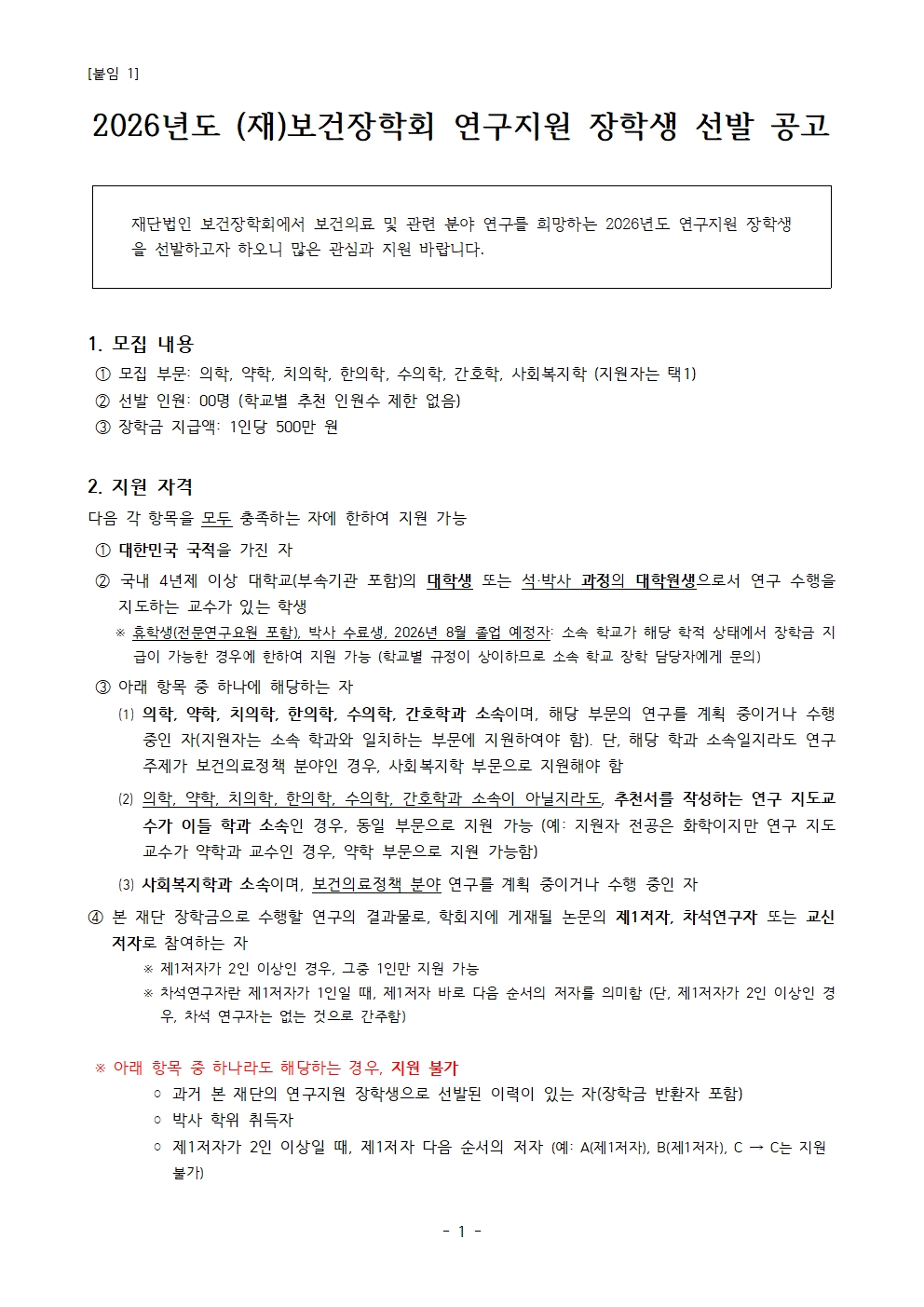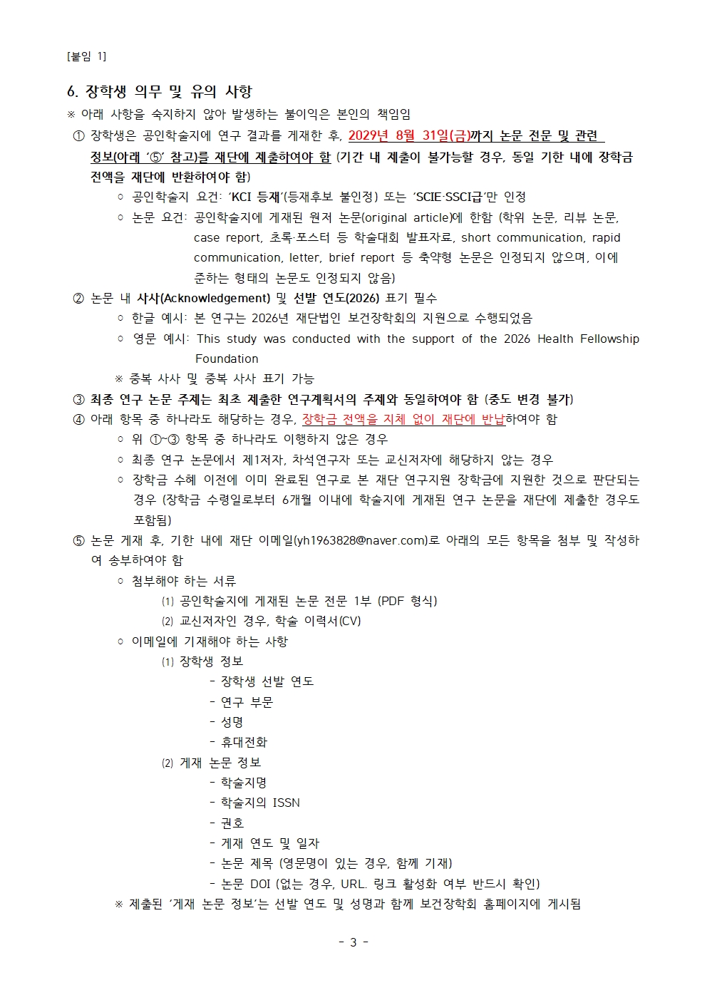 I 2026년도 재단법인 보건장학회 연구지원 장학생 선발 안내 I