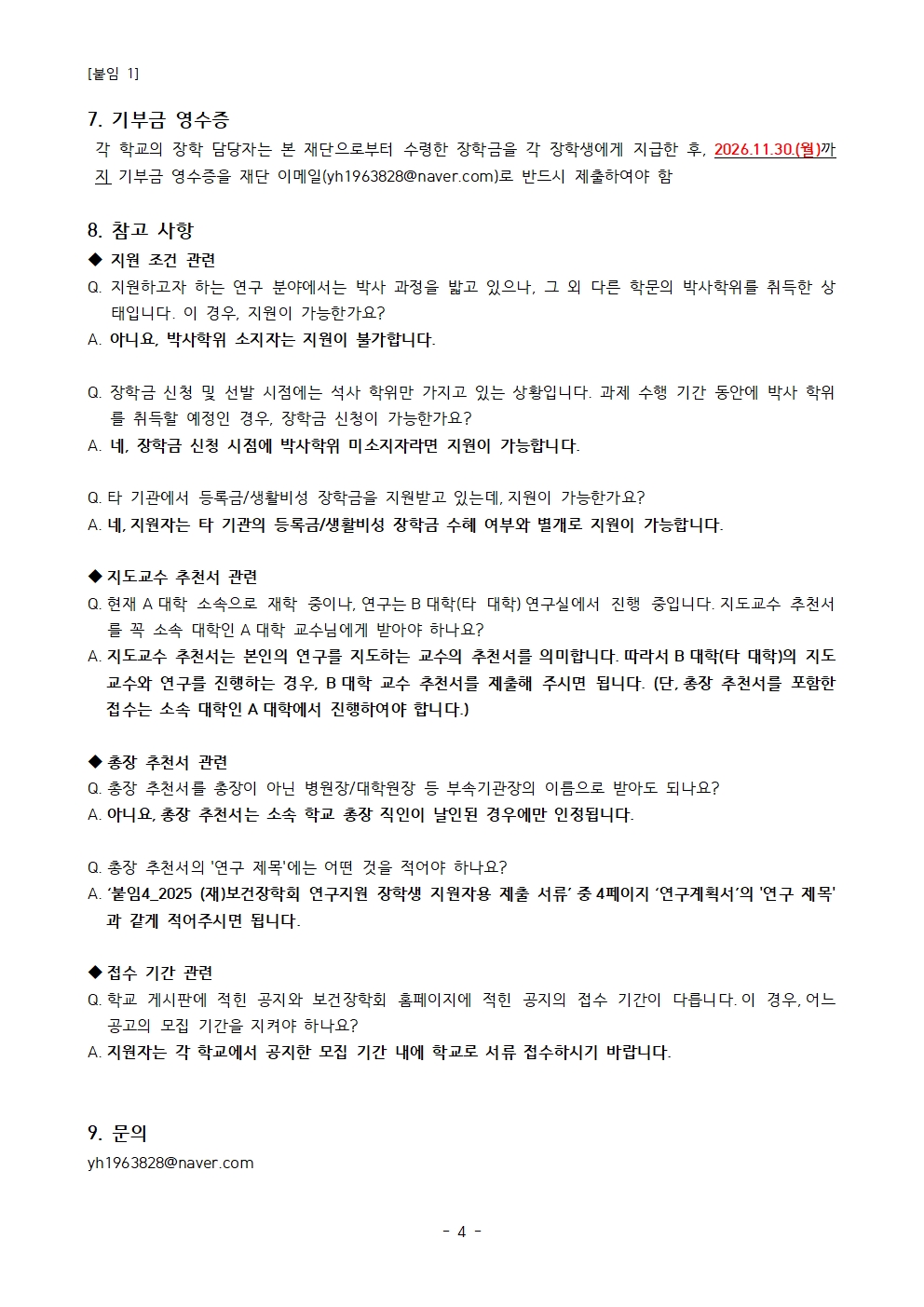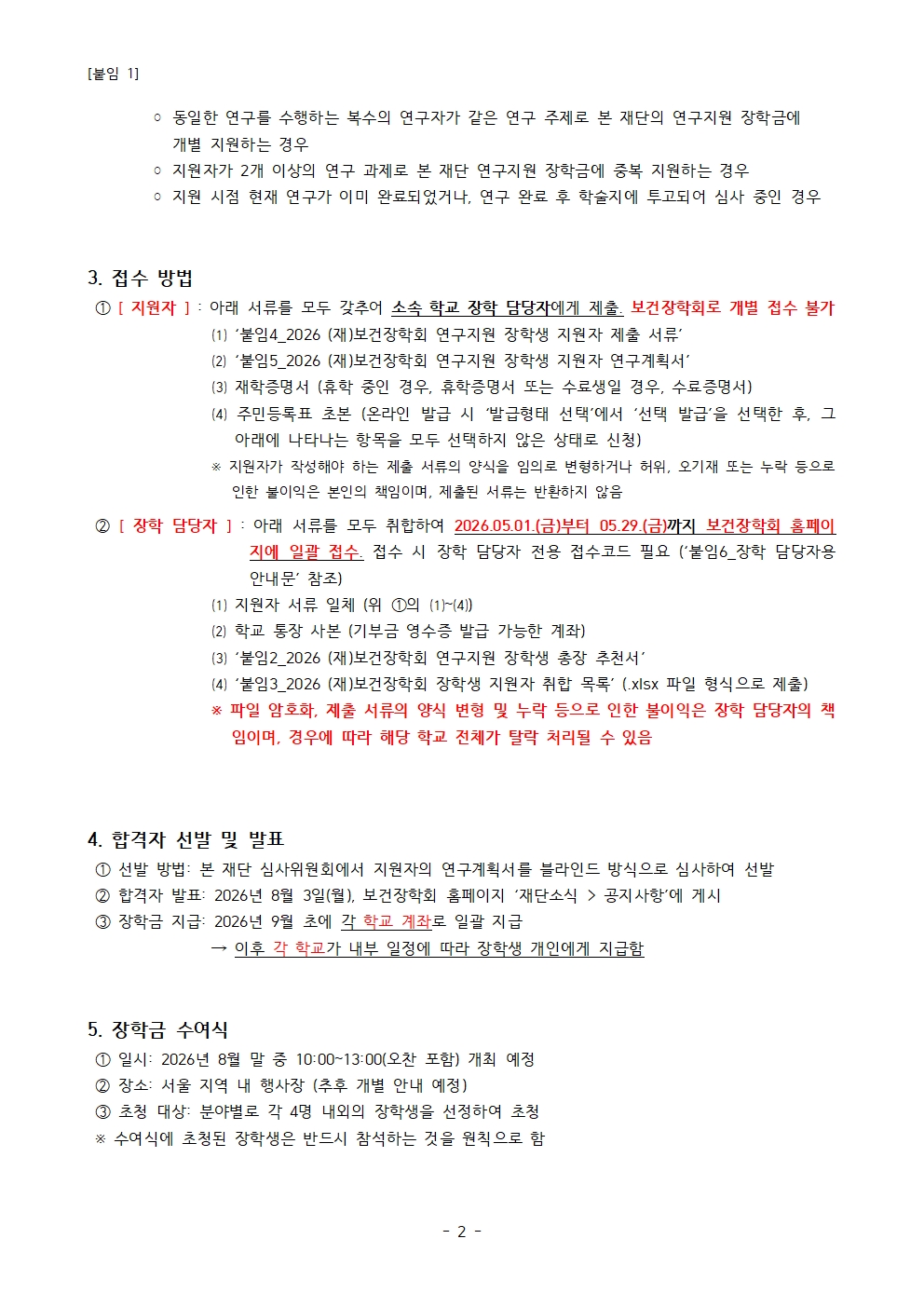 1. 제출기한: 2026년 5월 8일(금) 낮12시까지 (기한엄수) 2. 제출서류 * 지원자가 작성해야 하는 제출 서류의 양식을 임의로 변형하거나 허위, 오기재 또는 누락 등으로 인한 불이익은 본인의 책임이며, 제출된 서류는 반환하지 않음 가) 붙임4_2026 (재)보건장학회 연구지원 장학생 지원자 제출서류 1부 나) 붙임5_2026 (재)보건장학회 연구지원 장학생 연구계획서 1부 다) 재학증명서 (휴학 중인 경우, 휴학증명서 또는 수료생일 경우, 수료증명서) 라) 주민등록증 초본 (온라인 발급 시 '발급형태 선택'에서 '선택 발급' 후 그 아래에 나타나는 항목을 모두 선택하지 않은 상태로 신청) 3. 제출방법: 기한까지 학생회관 3층 학생처로 직접 제출