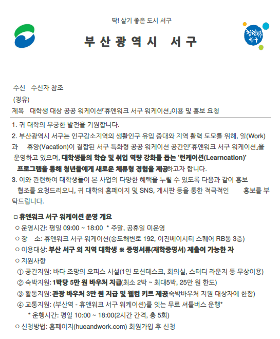외부공지 [부산광역시서구청]대학생 대상 공공 워케이션「휴앤워크 서구 워케이션」이용 안내 2026.01.09 조회수 22 취업지원팀 share facebook twitter kakaotalk 카카오톡 앱이설치된 모바일 기기에서만공유 가능합니다. https://www.syu.ac.kr/n0tf share 복사 휴앤워크-서구-워케이션-리플렛.pdf (463.2 KB) facebook twitter kakaotalk 카카오톡 앱이설치된 모바일 기기에서만공유 가능합니다. 이전글 [충남문화관광재단]2026년 충남문화관광재단 제1차 직원(기간제근로자) 경력·공개경쟁 채용 안내 다음글 [한국식품안전관리인증원]한국식품안전관리인증원 계약직 직원 채용 안내 목록