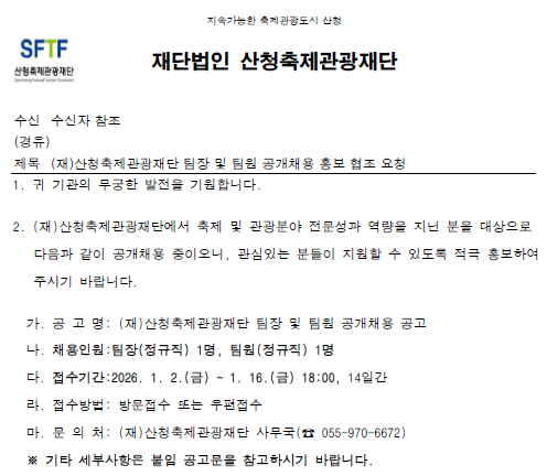 외부공지 [산청축제관광재단](재)산청축제관광재단 팀장 및 팀원 공개채용 안내 2025.12.30 조회수 168 취업지원팀 share facebook twitter kakaotalk 카카오톡 앱이설치된 모바일 기기에서만공유 가능합니다. https://www.syu.ac.kr/yo80 share 복사 재산청축제관광재단-팀장-및-팀원-공개채용-공고.pdf (157.4 KB) 응시자-지원서류별지-서식.hwp (65.0 KB) facebook twitter kakaotalk 카카오톡 앱이설치된 모바일 기기에서만공유 가능합니다. 이전글 글이 없습니다. 다음글 [유네스코국제무예센터]2026년 상반기 유네스코국제무예센터 영프로페셔널 채용 공고 안내 목록