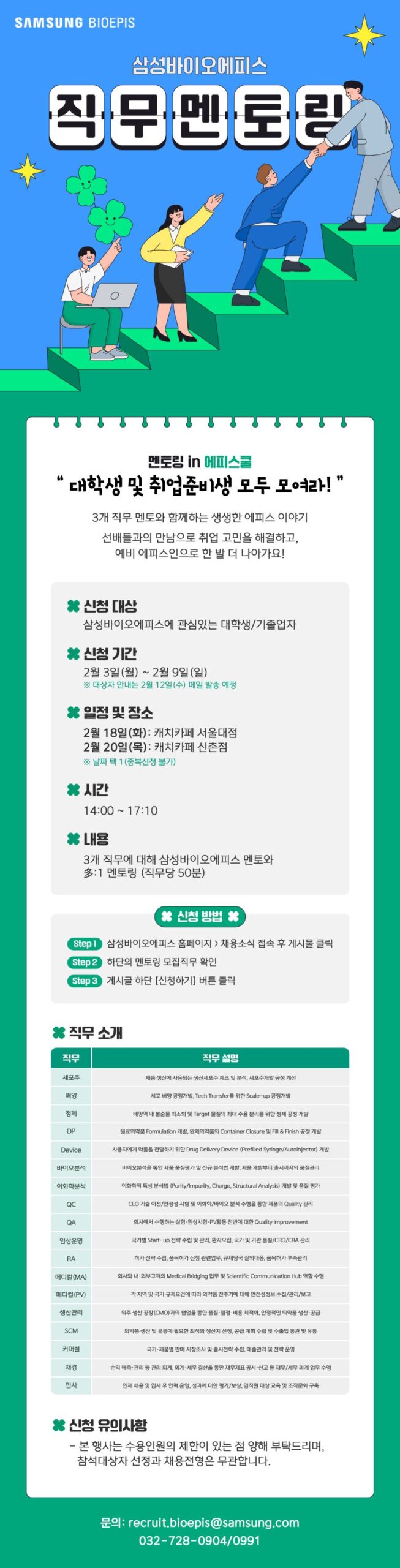 취업·창업공지 알림 [삼성바이오에피스] 직무멘토링 in 에피스쿨 홍보 2025.02.03 조회수 1,159 취업지원팀 share facebook twitter kakaotalk 카카오톡 앱이설치된 모바일 기기에서만공유 가능합니다. https://www.syu.ac.kr/ae0j share 복사 참고 URL : https://www.catch.co.kr/NCS/RecruitInfoDetails/483233 facebook twitter kakaotalk 카카오톡 앱이설치된 모바일 기기에서만공유 가능합니다. 이전글 알림[얼티밋커리어그룹] UCG 합격 메이트 서포터즈 안내 다음글 알림취업고민 해결하고 스타벅스 커피쿠폰 받자!_온라인 현직자 멘토링 이용자 100명 목록