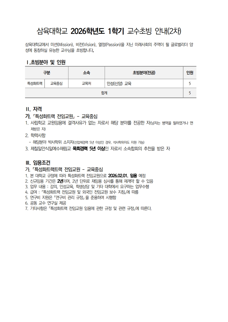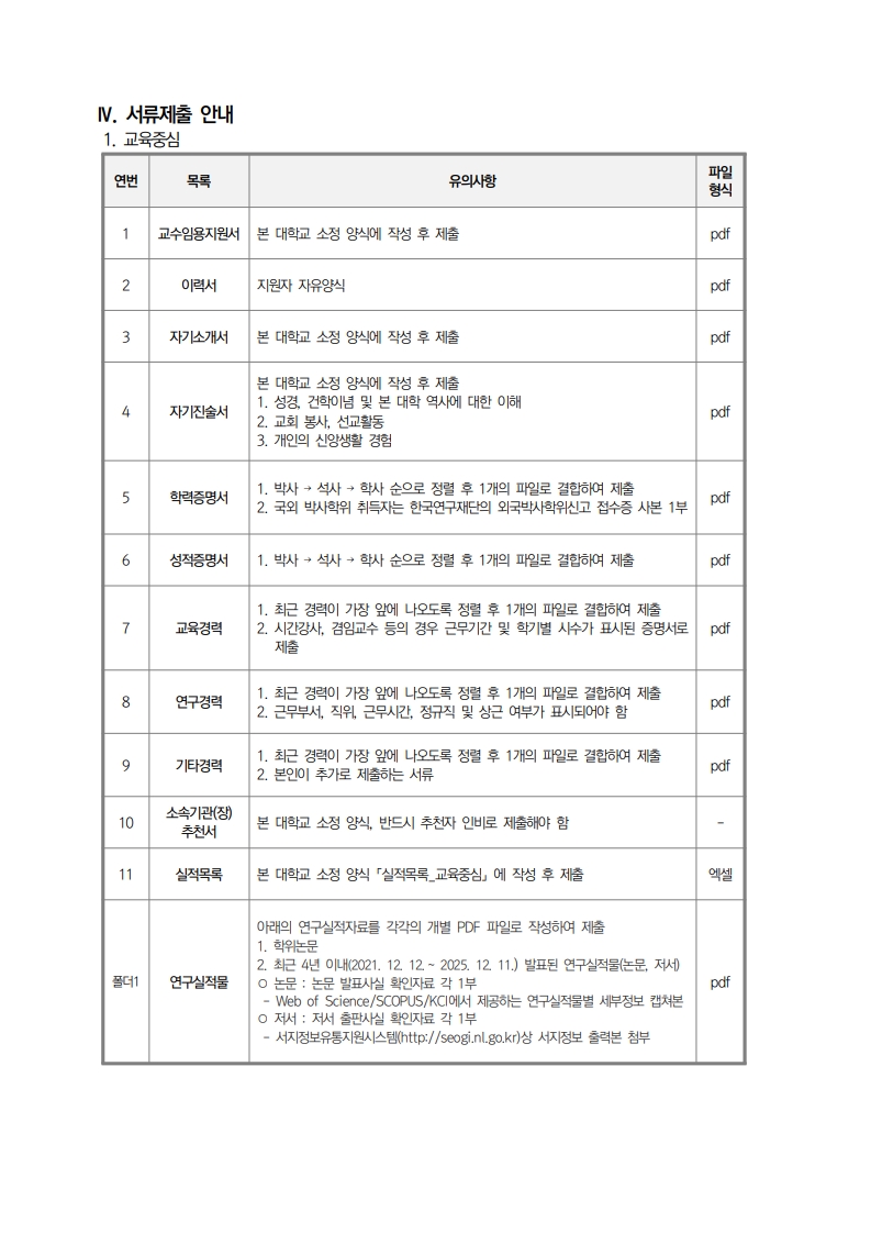 채용공고 삼육대학교 2026학년도 1학기교수초빙 안내(2차)(교육중심) 2025.12.12 조회수 622 교수지원팀 share facebook twitter kakaotalk 카카오톡 앱이설치된 모바일 기기에서만공유 가능합니다. https://www.syu.ac.kr/9j3t share 복사 01_교수임용지원서.hwp (280.5 KB) 02_자기소개서.hwp (265.5 KB) 03_자기진술서.hwp (258.5 KB) 04_소속-합회-추천서.hwp (22.5 KB) 05_실적목록_교육중심.xlsx (25.1 KB) 06_평가-및-심사-기준.hwp (64.0 KB) 07_심사-산정-기준논문-자격심사-경력인정-및-연구실적.pdf (72.6 KB) facebook twitter kakaotalk 카카오톡 앱이설치된 모바일 기기에서만공유 가능합니다. 이전글 글이 없습니다. 다음글 삼육대학교 2026학년도 1학기 교수초빙 안내(2차) 목록
