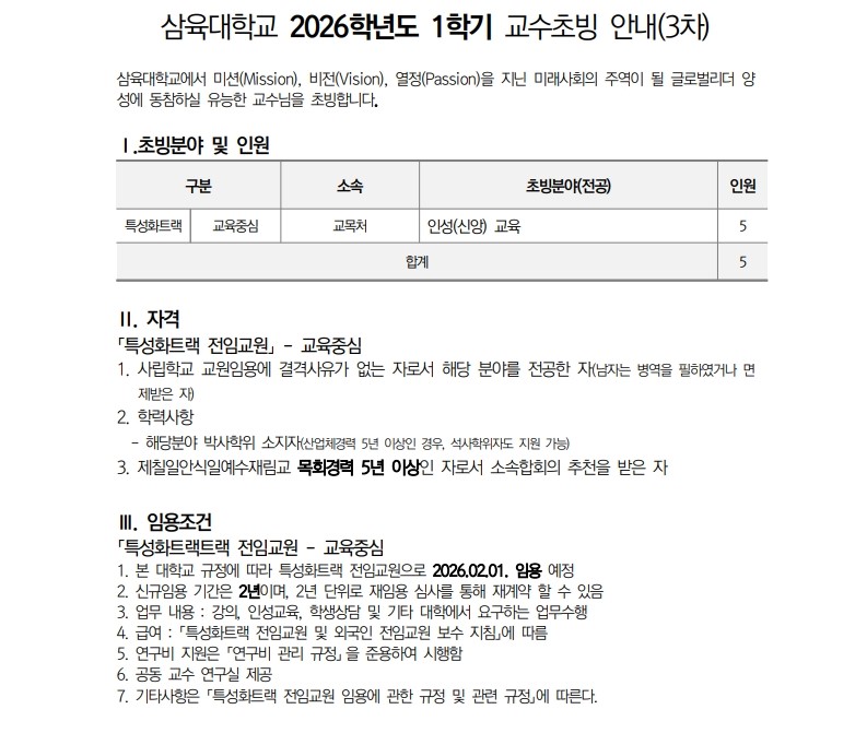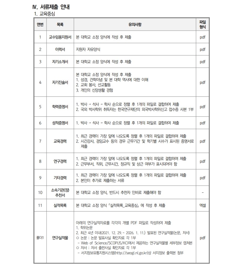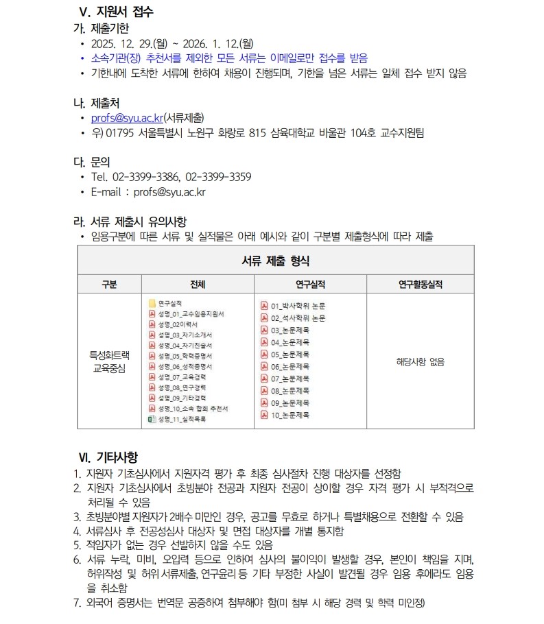 채용공고 삼육대학교 2026학년도 1학기교수초빙 안내(3차)(교육중심) 2025.12.29 조회수 321 교수지원팀 share facebook twitter kakaotalk 카카오톡 앱이설치된 모바일 기기에서만공유 가능합니다. https://www.syu.ac.kr/zs6q share 복사 01_교수임용지원서.hwp (280.5 KB) 02_자기소개서.hwp (265.5 KB) 04_소속-합회-추천서.hwp (22.5 KB) 03_자기진술서.hwp (258.5 KB) 05_실적목록_교육중심.xlsx (25.1 KB) 평가표교육중심.pdf (31.6 KB) 기준표-1.pdf (62.8 KB) facebook twitter kakaotalk 카카오톡 앱이설치된 모바일 기기에서만공유 가능합니다. 이전글 글이 없습니다. 다음글 삼육대학교 2026학년도 1학기 교수초빙 안내(3차) 목록
