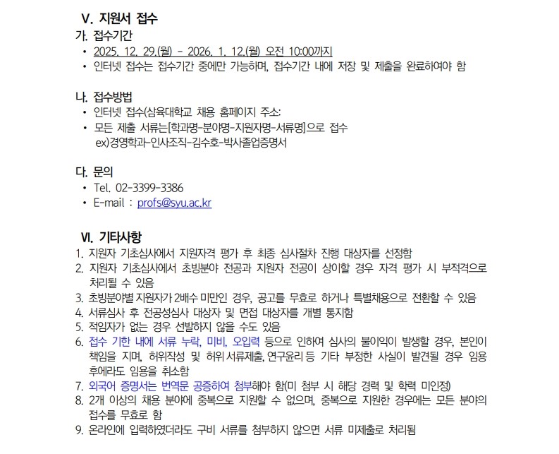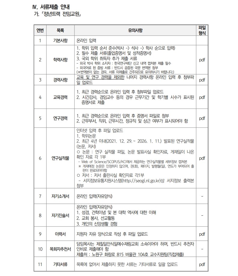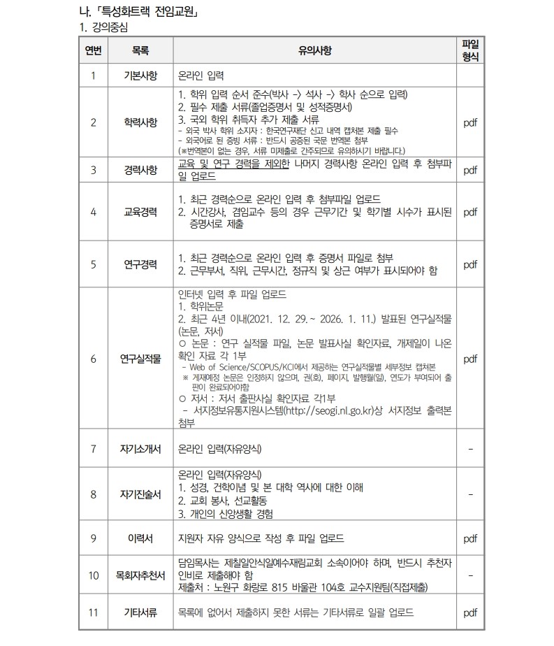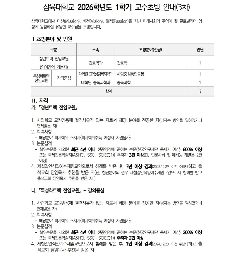 채용공고 삼육대학교 2026학년도 1학기 교수초빙 안내(3차) 2025.12.29 조회수 340 교수지원팀 share facebook twitter kakaotalk 카카오톡 앱이설치된 모바일 기기에서만공유 가능합니다. https://www.syu.ac.kr/l743 share 복사 평가표정년트랙-강의중심.pdf (38.5 KB) 기준표-1.pdf (62.8 KB) facebook twitter kakaotalk 카카오톡 앱이설치된 모바일 기기에서만공유 가능합니다. 이전글 글이 없습니다. 다음글 삼육대학교 직원(계약직_미화) 채용 공고 2026년 2월1일부 목록