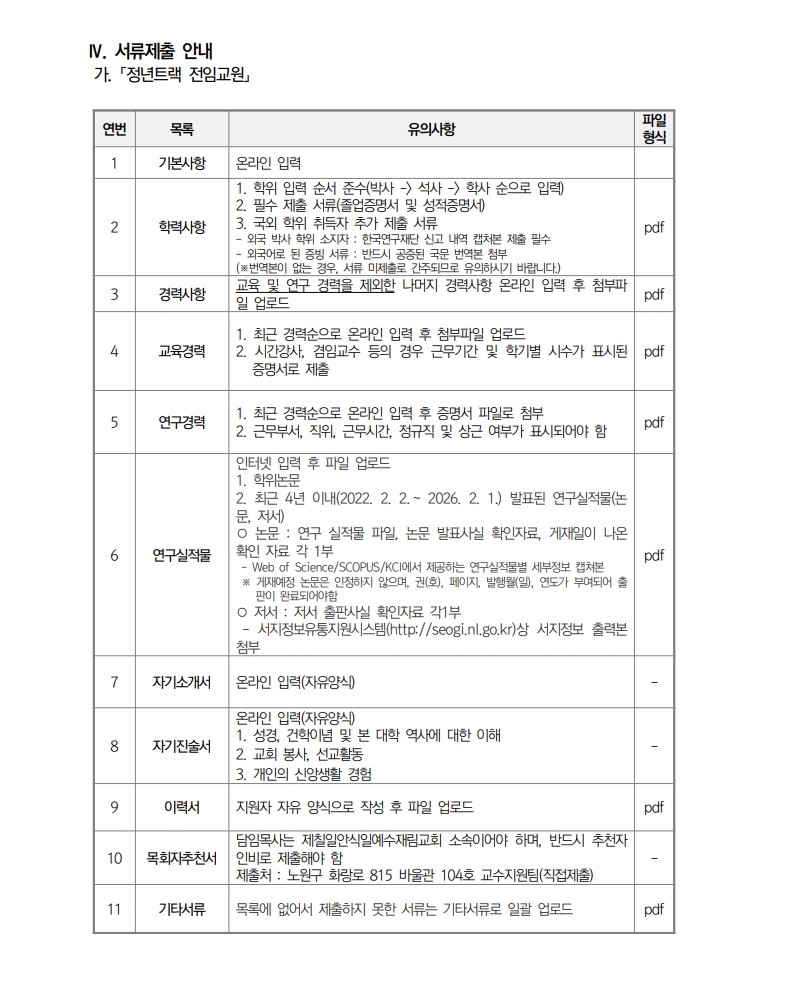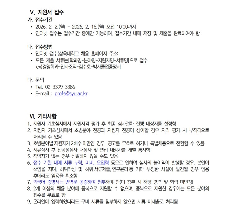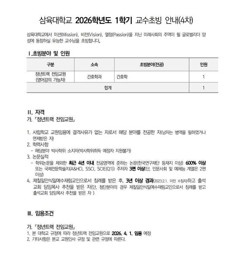 채용공고 삼육대학교 2026학년도 1학기 교수초빙 안내(4차) 2026.02.02 조회수 663 교수지원팀 share facebook twitter kakaotalk 카카오톡 앱이설치된 모바일 기기에서만공유 가능합니다. https://www.syu.ac.kr/8r1a share 복사 기준표.pdf (62.9 KB) 평가표.pdf (31.9 KB) facebook twitter kakaotalk 카카오톡 앱이설치된 모바일 기기에서만공유 가능합니다. 이전글 글이 없습니다. 다음글 삼육대학교 2026학년도 1학기 겸임교수 공개채용 공고(3차) 목록
