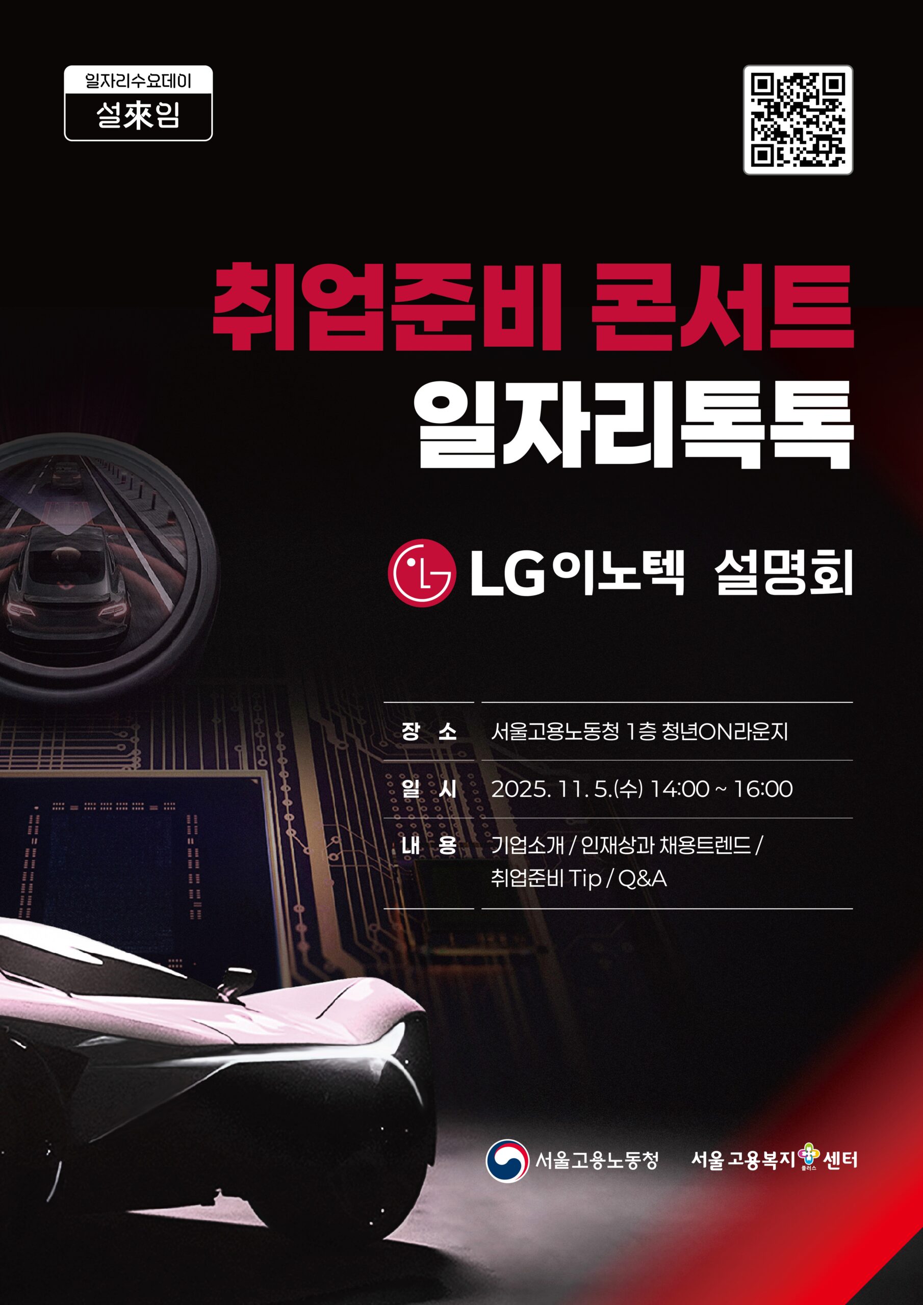외부공지 서울고용노동청과 함께하는 LG이노텍 취업준비콘서트 일자리톡톡 홍보 2025.10.29 조회수 9 취업지원팀 share facebook twitter kakaotalk 카카오톡 앱이설치된 모바일 기기에서만공유 가능합니다. https://www.syu.ac.kr/xaba share 복사 facebook twitter kakaotalk 카카오톡 앱이설치된 모바일 기기에서만공유 가능합니다. 이전글 글이 없습니다. 다음글 동아쏘시오그룹 하반기 공채~11/02 목록