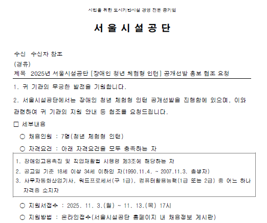외부공지 [서울시설공단]2025년 서울시설공단 [장애인 청년 체험형 인턴] 공개선발 홍보 안내 2025.11.05 조회수 18 취업지원팀 share facebook twitter kakaotalk 카카오톡 앱이설치된 모바일 기기에서만공유 가능합니다. https://www.syu.ac.kr/ravd share 복사 2025년-장애인-청년-체험형-인턴-공개선발-공고문.pdf (448.2 KB) facebook twitter kakaotalk 카카오톡 앱이설치된 모바일 기기에서만공유 가능합니다. 이전글 [차세대융합기술연구원]차세대융합기술연구원 채용공고 안내 다음글 [한양여자대학교][한양여자대학교 대학일자리플러스센터] 취업프로그램 홍보 안내 목록