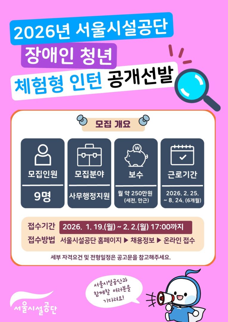 외부공지 [서울시설공단]2026년 서울시설공단 [장애인 청년 체험형 인턴] 공개선발 공고 안내 2026.01.20 조회수 165 취업지원팀 share facebook twitter kakaotalk 카카오톡 앱이설치된 모바일 기기에서만공유 가능합니다. https://www.syu.ac.kr/sqf0 share 복사 홍보용-포스터.pdf (251.1 KB) facebook twitter kakaotalk 카카오톡 앱이설치된 모바일 기기에서만공유 가능합니다. 이전글 글이 없습니다. 다음글 [서귀포시]서귀포공립미술관장(개방형직위) 임용시험 공고 안내 목록