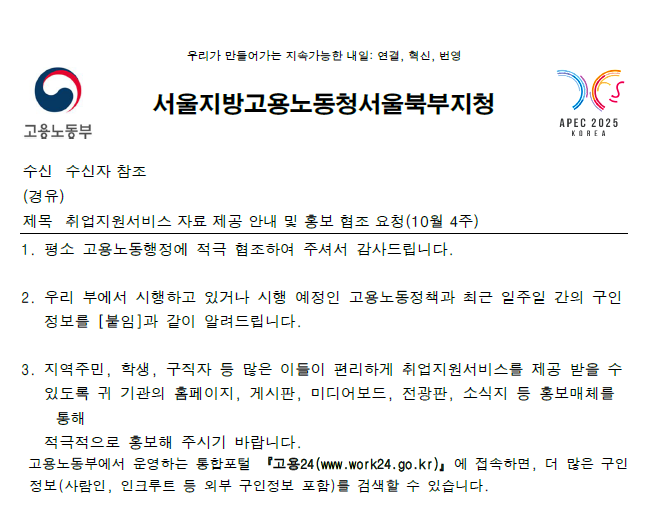 외부공지 [서울지방고용노동청서울북부지청]취업지원서비스 자료 제공 안내 및 홍보 협조 요청(10월 4주) 2025.10.24 조회수 28 취업지원팀 share facebook twitter kakaotalk 카카오톡 앱이설치된 모바일 기기에서만공유 가능합니다. https://www.syu.ac.kr/1ktp share 복사 홍보보도자료고용노동부-25.10.23.pdf (396.0 KB) 구인정보서울북부고용복지센터-2025.10.23.pdf (102.0 KB) facebook twitter kakaotalk 카카오톡 앱이설치된 모바일 기기에서만공유 가능합니다. 이전글 2025학년도 동계 CHANGE the WORLD 추가모집 공고_국외봉사대 다음글 2025년 대학일자리플러스센터 수기공모전 개최 안내 목록