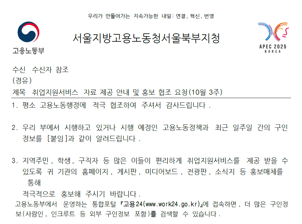 외부공지 [서울지방고용노동청서울북부지청]취업지원서비스 자료 제공 안내 및 홍보(10월 3주) 2025.10.27 조회수 14 취업지원팀 share facebook twitter kakaotalk 카카오톡 앱이설치된 모바일 기기에서만공유 가능합니다. https://www.syu.ac.kr/3xqz share 복사 서울지방고용노동청서울북부지청취업지원서비스-자료-제공-안내-및-홍보10월-3주.png (81.2 KB) 구인정보서울북부고용복지센터-2025.10.16.-복사.pdf (101.7 KB) 홍보보도자료고용노동부-25.10.16-복사.pdf (144.3 KB) facebook twitter kakaotalk 카카오톡 앱이설치된 모바일 기기에서만공유 가능합니다. 이전글 [노동부지원무료IT취업과정]웹앱개발/풀스택/빅데이터/인공지능외 다음글 [서울지방고용노동청]서울지역 청년을 위한『고용24 취업특강(취업Dreamers)』운영 안내(10월) 목록