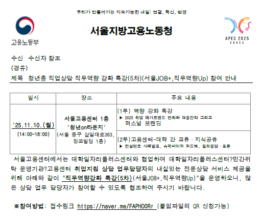 외부공지 [서울지방고용노동청]청년층 직업상담 직무역량 강화 특강(5차)(서울JOB+,직무역량Up) 참여 안내 2025.11.03 조회수 231 취업지원팀 share facebook twitter kakaotalk 카카오톡 앱이설치된 모바일 기기에서만공유 가능합니다. https://www.syu.ac.kr/4p92 share 복사 청년층-직업상담-직무역량강화-특강5차-서울job-운영안내.pdf (98.4 KB) facebook twitter kakaotalk 카카오톡 앱이설치된 모바일 기기에서만공유 가능합니다. 이전글 [서울지방고용노동청서울북부지청]취업지원서비스 자료 제공 안내 및 홍보 안내 다음글 [한국장애인개발원]장애청년 채용 취업 정보 안내(11월 1차) 목록