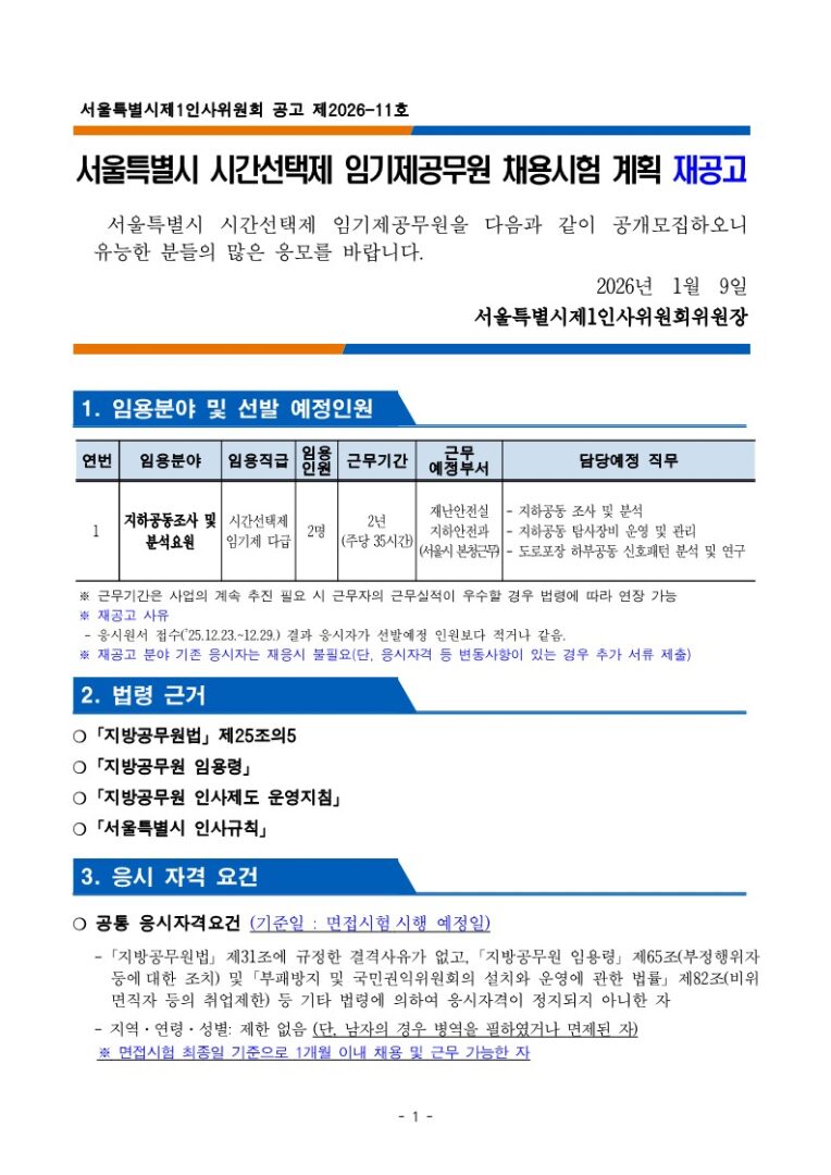 외부공지 [서울특별시]서울특별시 시간선택임기제공무원(지반침하조사 및 분석) 채용 안내 2026.01.20 조회수 149 취업지원팀 share facebook twitter kakaotalk 카카오톡 앱이설치된 모바일 기기에서만공유 가능합니다. https://www.syu.ac.kr/hnf0 share 복사 공고다급gpr-공고문_.pdf (621.6 KB) 다급gpr-제출서류_.hwpx (254.1 KB) facebook twitter kakaotalk 카카오톡 앱이설치된 모바일 기기에서만공유 가능합니다. 이전글 [새만금개발청]새만금개발청 일반임기제 공무원(행정6급, 영상PD) 경력경쟁채용시험 안내 다음글 [한국대학교육협의회]「2026 공공기관 채용정보박람회」 장애인 채용상담부스 운영 안내 목록
