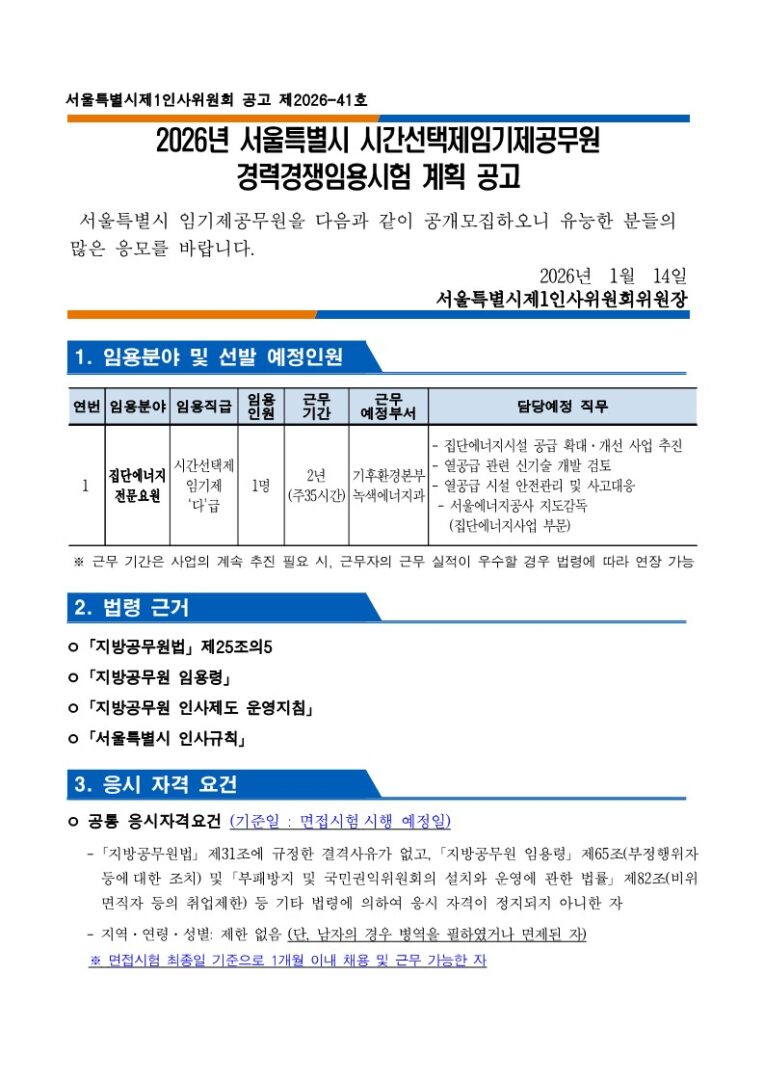 외부공지 [서울특별시]시간선택제 임기제 공무원(집단에너지 전문요원) 채용 안내 2026.01.20 조회수 150 취업지원팀 share facebook twitter kakaotalk 카카오톡 앱이설치된 모바일 기기에서만공유 가능합니다. https://www.syu.ac.kr/z45h share 복사 1.-공고문.pdf (678.5 KB) 2.-제출-서류-및-양식.hwpx (129.5 KB) facebook twitter kakaotalk 카카오톡 앱이설치된 모바일 기기에서만공유 가능합니다. 이전글 [서울지방고용노동청서울북부지청]취업지원서비스 자료 제공 안내 및 홍보 협조 요청(1주 3주) 다음글 [재단법인 동천] 2026년 상반기 33기 프로보노 어시스턴트 모집 목록