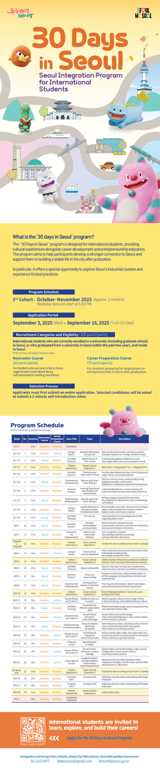 외부공지 [서울특별시]외국인 유학생 지원 프로그램 ’30일간의 서울일주’ 2기 모집 홍보 2025.09.04 조회수 2,731 취업지원팀 share facebook twitter kakaotalk 카카오톡 앱이설치된 모바일 기기에서만공유 가능합니다. https://www.syu.ac.kr/25bt share 복사 facebook twitter kakaotalk 카카오톡 앱이설치된 모바일 기기에서만공유 가능합니다. 이전글 [서울AI재단]2025년 제4차 신규직원(정규직·계약직) 채용 홍보 다음글 [서울지방고용노동청서울북부지청]서울북부 청년기자단 3기 모집 홍보 목록