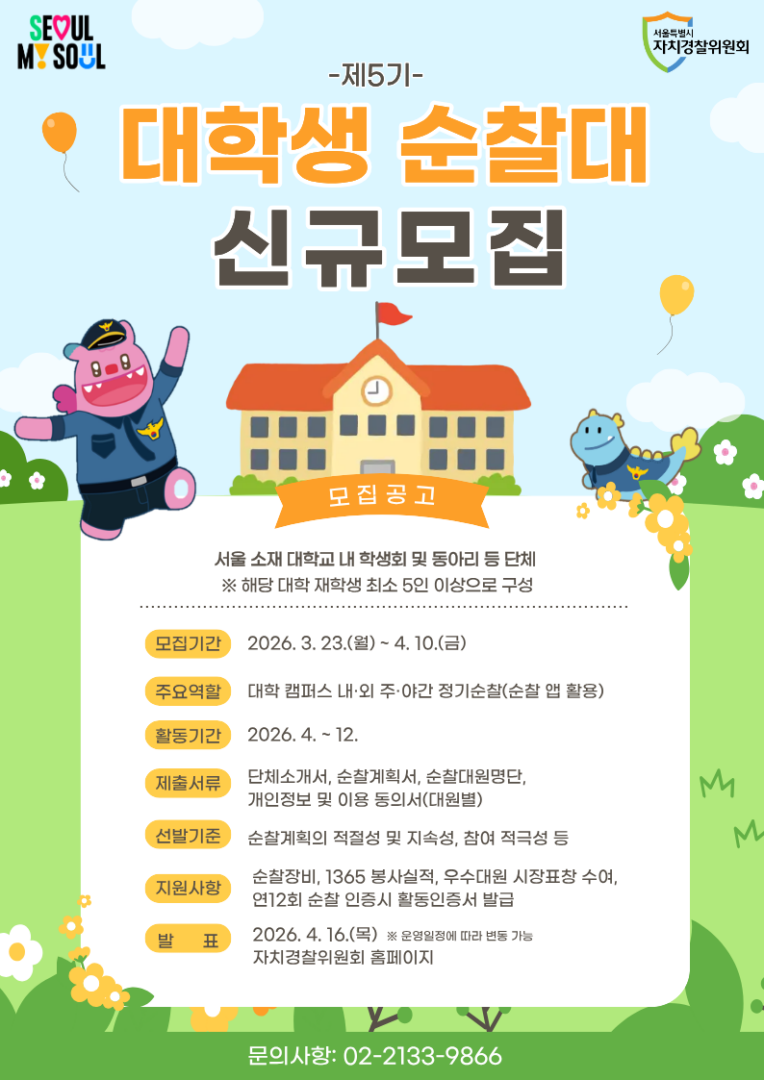 외부공지 [서울특별시자치경찰위원회] 2026년 대학생 순찰대 신규모집 홍보 2026.03.26 조회수 806 학생처 share facebook twitter kakaotalk 카카오톡 앱이설치된 모바일 기기에서만공유 가능합니다. https://www.syu.ac.kr/i6xs share 복사 1.-2026년-대학생-순찰대-모집-공고-1.pdf (159.1 KB) 2.-2026년-제5기-대학생-순찰대-지원서.hwpx (44.9 KB) facebook twitter kakaotalk 카카오톡 앱이설치된 모바일 기기에서만공유 가능합니다. 이전글 글이 없습니다. 다음글 2026년 제1차 연구과제 수행 위촉연구원 채용공고문 목록