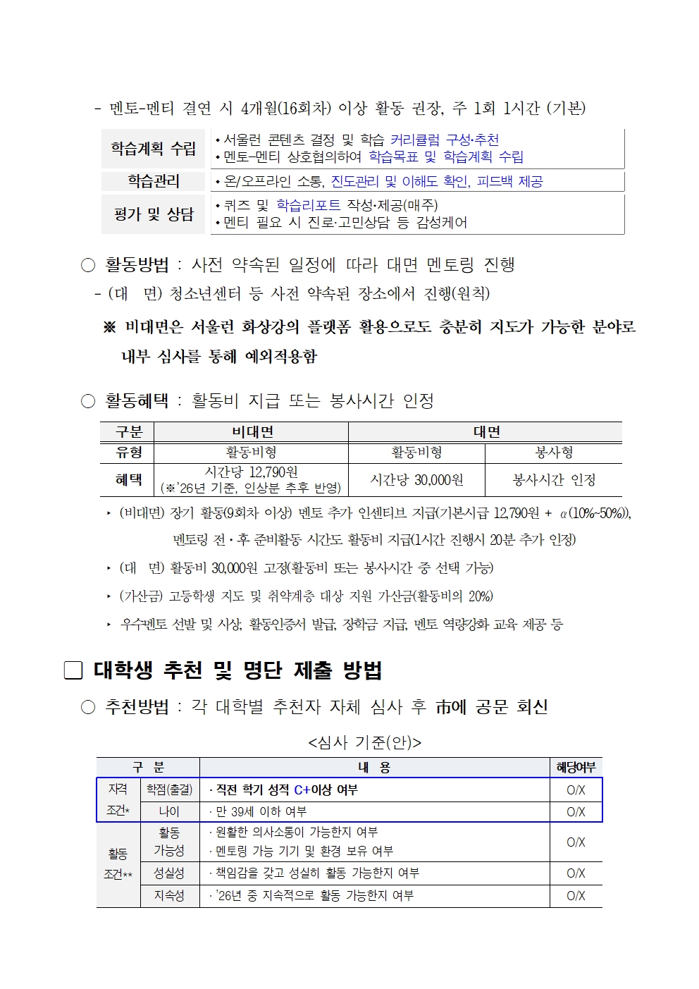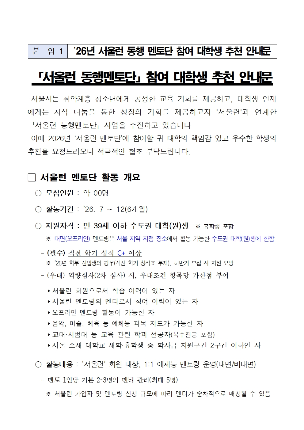 4. 신청서 파일명: 서울런 멘토단 참여 지원서_학번_학과_학년_이름 으로 제출할 것.