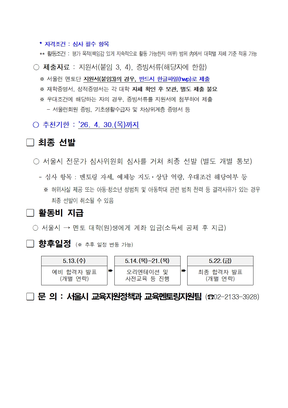 대학에서 4월 27일(월)까지 접수 후  4월 30일(목)까지 지원 서류 일체를 서울시 교육지원정책과에 발송해야 합니다.