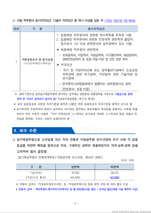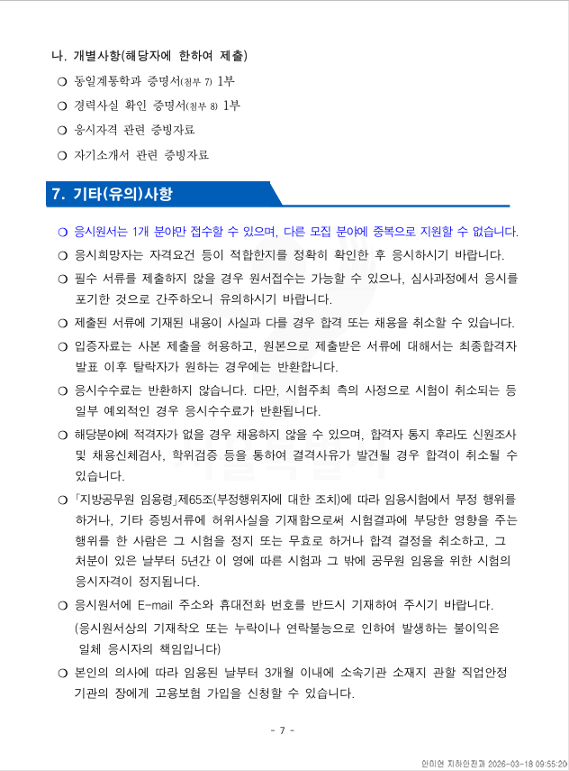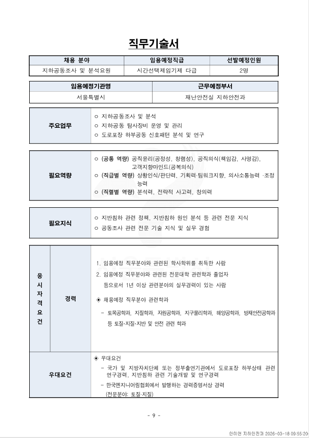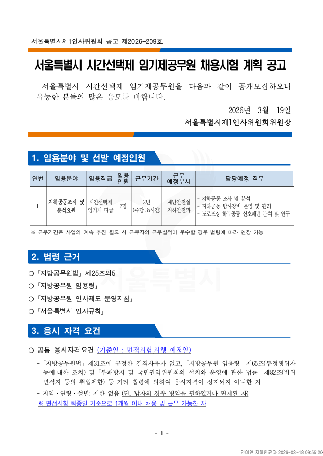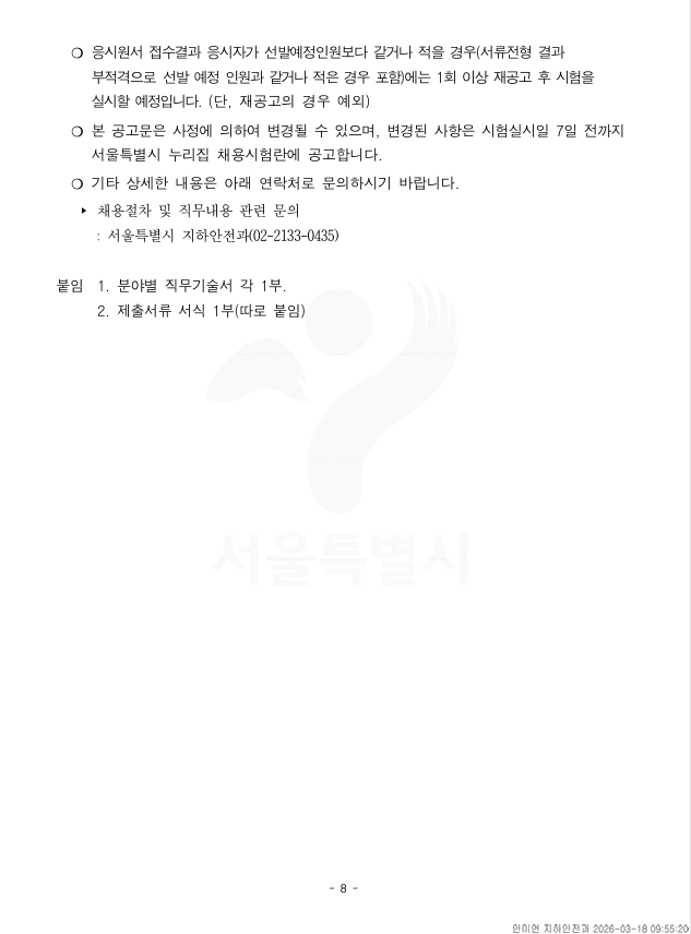 외부공지 서울특별시 시간선택임기제공무원(지하공동조사 및 분석) 채용 2026.03.20 조회수 70 취업지원팀 share facebook twitter kakaotalk 카카오톡 앱이설치된 모바일 기기에서만공유 가능합니다. https://www.syu.ac.kr/b3di share 복사 제출서류_.hwp (112.5 KB) facebook twitter kakaotalk 카카오톡 앱이설치된 모바일 기기에서만공유 가능합니다. 이전글 2026년도 한국재정정보원 제2차 채용공고문 다음글 2026 이공계 장애대학생 진로개발 지원사업 목록