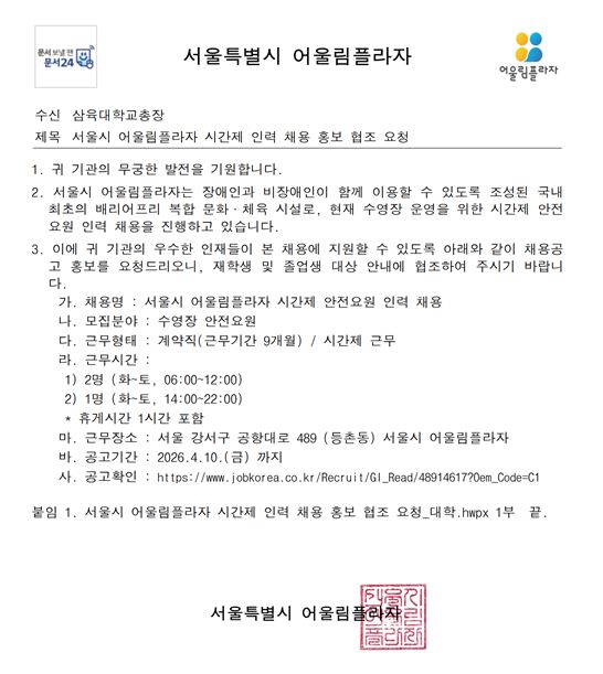 외부공지 서울특별시 어울림플라자 시간제 인력 채용공고 2026.04.06 조회수 604 취업지원팀 share facebook twitter kakaotalk 카카오톡 앱이설치된 모바일 기기에서만공유 가능합니다. https://www.syu.ac.kr/w14v share 복사 facebook twitter kakaotalk 카카오톡 앱이설치된 모바일 기기에서만공유 가능합니다. 이전글 글이 없습니다. 다음글 국가녹색기술연구소(NIGT) 제1차 석사후연구원 채용공고 (~26.4.17.(금) 오후 4시까지) 목록