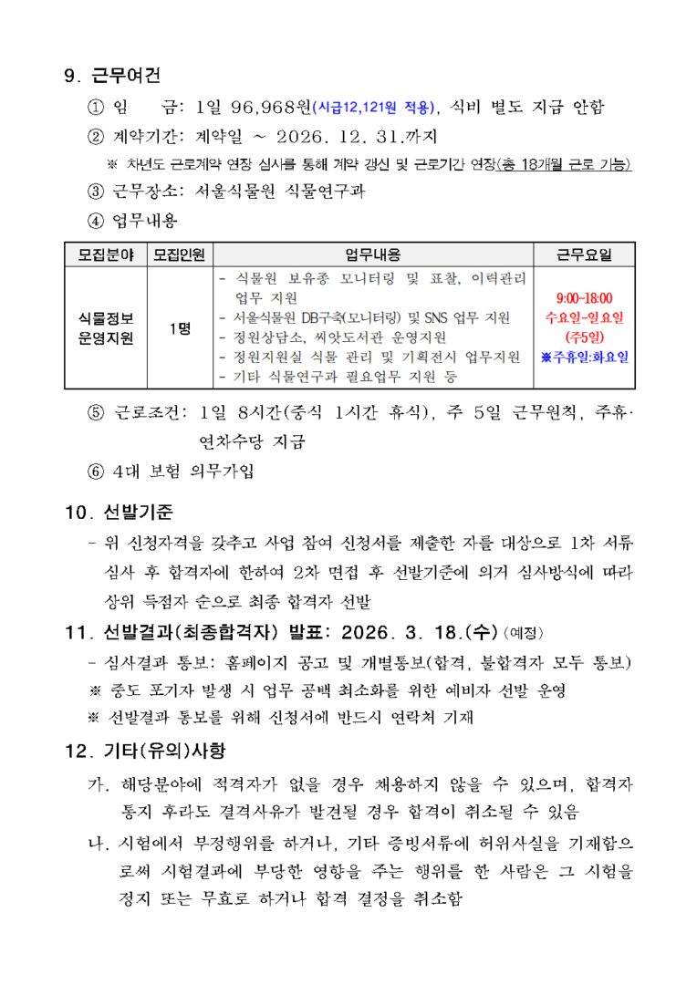 외부공지 서울 매력일자리 서울식물원 마스터가드너사업 참여자 모집 공고 2026.03.26 조회수 9 취업지원팀 share facebook twitter kakaotalk 카카오톡 앱이설치된 모바일 기기에서만공유 가능합니다. https://www.syu.ac.kr/8ujy share 복사 공고문-1.hwpx (76.6 KB) 참여-신청서-등-서식.hwpx (73.5 KB) facebook twitter kakaotalk 카카오톡 앱이설치된 모바일 기기에서만공유 가능합니다. 이전글 글이 없습니다. 다음글 2026년 이공계 장애대학생 현장 연구지원 프로그램 참여자 모집(2차) 안내 및 홍보 목록