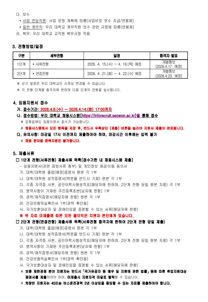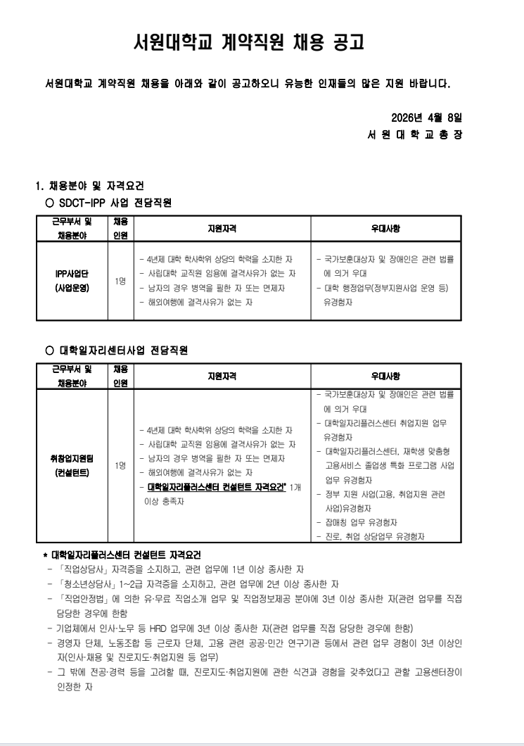 외부공지 서원대학교 계약직원 채용 공고 2026.04.10 조회수 121 취업지원팀 share facebook twitter kakaotalk 카카오톡 앱이설치된 모바일 기기에서만공유 가능합니다. https://www.syu.ac.kr/gelq share 복사 facebook twitter kakaotalk 카카오톡 앱이설치된 모바일 기기에서만공유 가능합니다. 이전글 글이 없습니다. 다음글 2026년 ‘미래 성장산업 취업전환 사업’ 무료 취업교육생 모집공고 목록