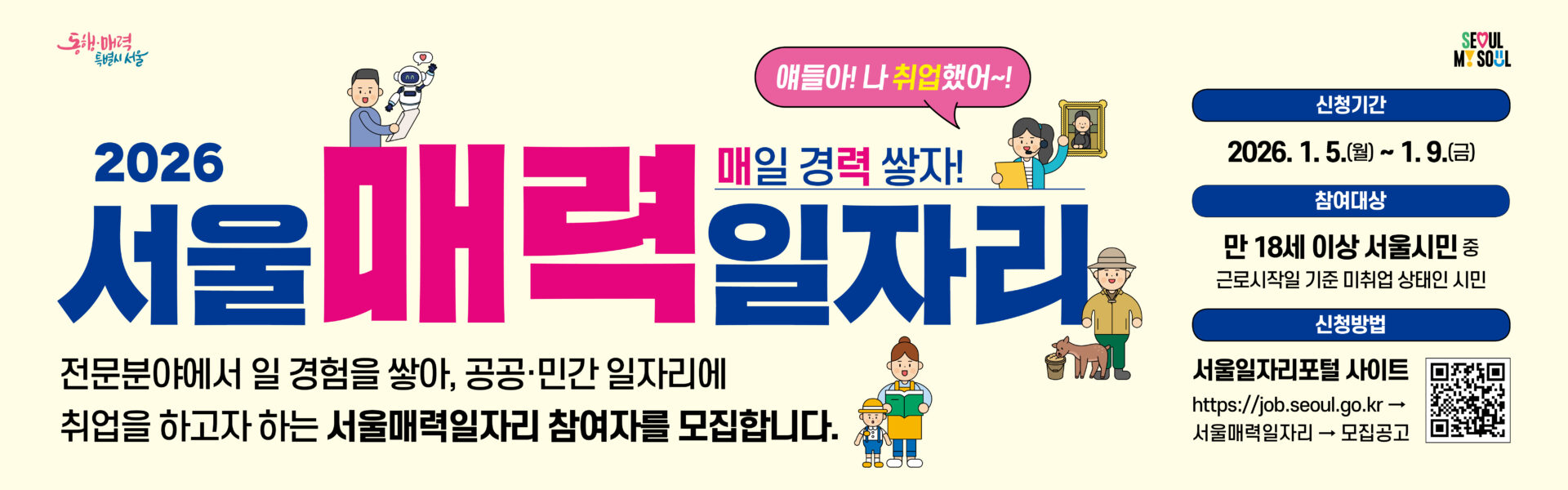외부공지 [서 울 특 별 시]『2026 서울 매력일자리 사업』 통합공고에 따른 참여자 모집 안내 2025.12.26 조회수 44 취업지원팀 share facebook twitter kakaotalk 카카오톡 앱이설치된 모바일 기기에서만공유 가능합니다. https://www.syu.ac.kr/b1v5 share 복사 1.-2026-서울매력일자리-리플릿.pdf (1.4 MB) 2.-2026-서울매력일자리-포스터.pdf (557.9 KB) facebook twitter kakaotalk 카카오톡 앱이설치된 모바일 기기에서만공유 가능합니다. 이전글 글이 없습니다. 다음글 [화성시인재육성재단]2026년 화성 into 테크노폴 10기 뉴질랜드 탐방단 모집 안내 목록