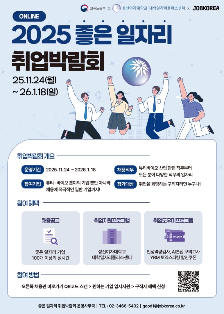 외부공지 [성신여자대학교]2025 좋은 일자리 취업박람회 홍보 안내 2025.11.25 조회수 30 취업지원팀 share facebook twitter kakaotalk 카카오톡 앱이설치된 모바일 기기에서만공유 가능합니다. https://www.syu.ac.kr/50nf share 복사 facebook twitter kakaotalk 카카오톡 앱이설치된 모바일 기기에서만공유 가능합니다. 이전글 글이 없습니다. 다음글 [동서울대학교]동서울대학교 직원 채용 공고 안내 목록