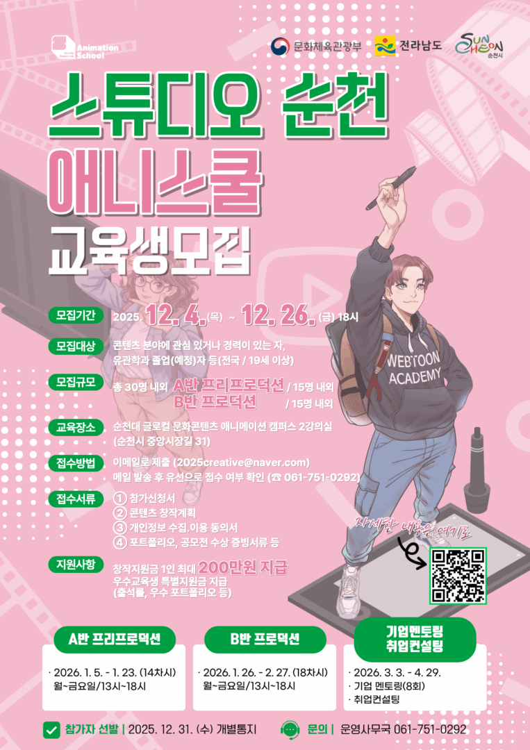 외부공지 [순천시]대한민국 문화도시 순천 「스튜디오 순천 애니메이션 스쿨」 교육생 모집 안내 2025.12.08 조회수 218 취업지원팀 share facebook twitter kakaotalk 카카오톡 앱이설치된 모바일 기기에서만공유 가능합니다. https://www.syu.ac.kr/zzct share 복사 공고문스튜디오-순천-애니메이션스쿨-교육생-모집.hwp (88.0 KB) 신청서식스튜디오-순천-애니메이션-스쿨.hwp (50.5 KB) facebook twitter kakaotalk 카카오톡 앱이설치된 모바일 기기에서만공유 가능합니다. 이전글 [그랜드코리아레저(주)] 2026년 제1차 융복합 관광인재 양성교육 안내 다음글 [순천시]대한민국 문화도시 순천 「스튜디오 순천 웹툰 스쿨」 교육생 모집 안내 목록