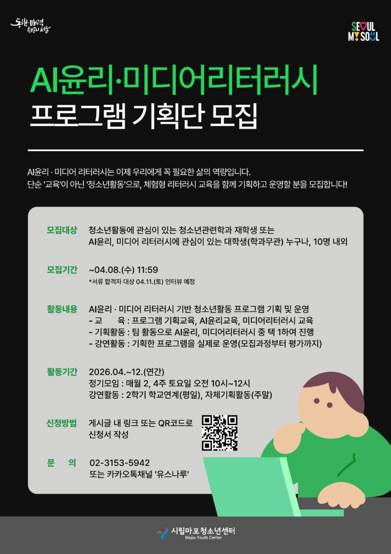 외부공지 [시립마포청소년센터] AI윤리미디어리터러시 또래강사 모집 홍보 2026.03.26 조회수 537 취업지원팀 share facebook twitter kakaotalk 카카오톡 앱이설치된 모바일 기기에서만공유 가능합니다. https://www.syu.ac.kr/arp7 share 복사 잘못된 파일 정보입니다. facebook twitter kakaotalk 카카오톡 앱이설치된 모바일 기기에서만공유 가능합니다. 이전글 글이 없습니다. 다음글 2026 서울시 빅데이터 캠퍼스 전문교육 과정 안내 목록
