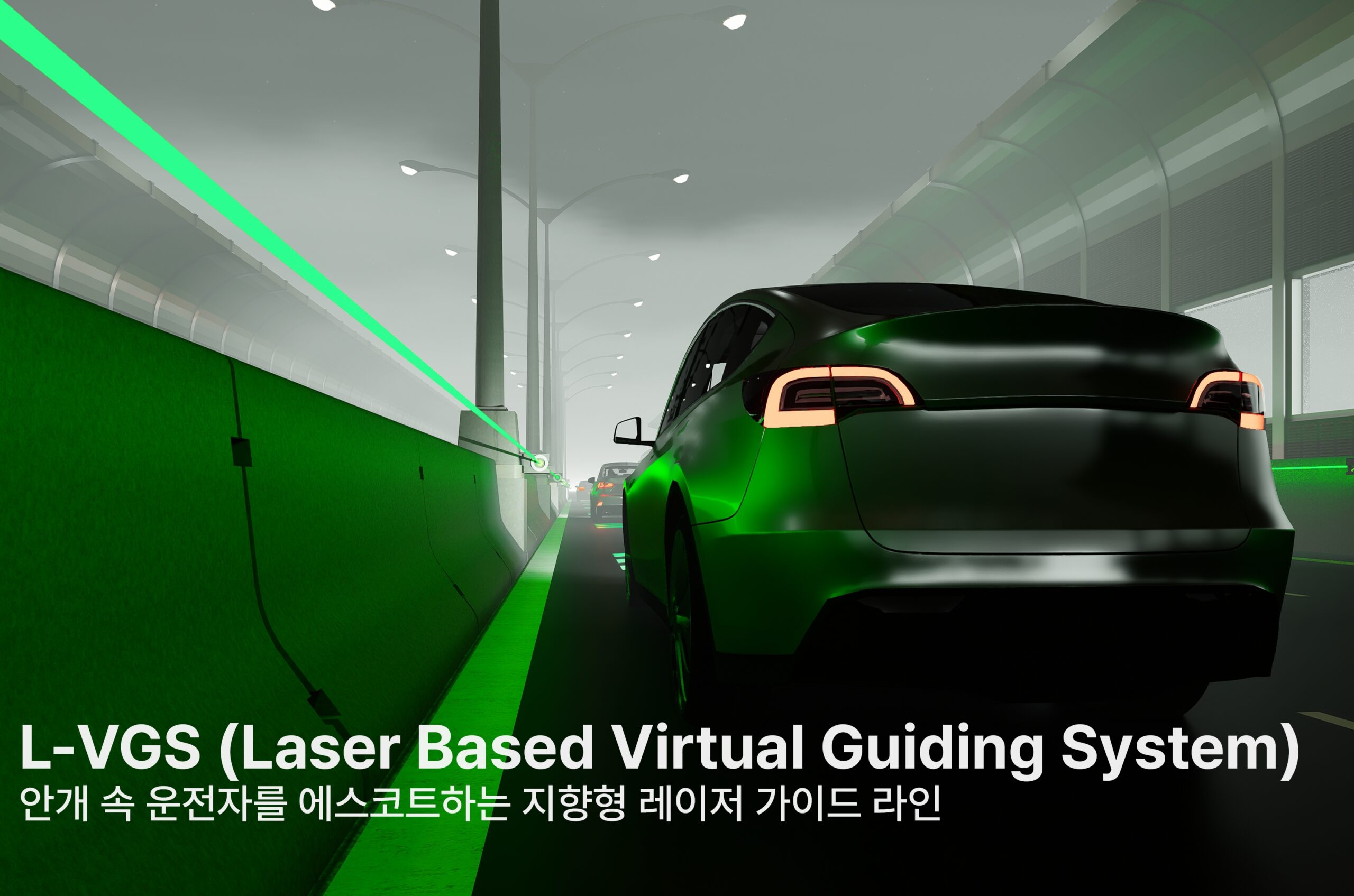 The system is divided into three levels depending on fog intensity: △Fog Advisory △Fog Hazard △Severe. It applies a 520mm-wavelength green laser, and it also improved maintenance efficiency by adopting materials and finishing that consider waterproof and impact-resistant performance, as well as a modular fastening method that allows simple replacement. Another eye-catching feature is the use of a chevron pattern (>>>) at regular intervals to create a visual rhythm.