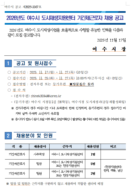 외부공지 [여수시]2026년도 여수시 도시재생지원센터 기간제근로자 채용 안내 2025.11.18 조회수 19 취업지원팀 share facebook twitter kakaotalk 카카오톡 앱이설치된 모바일 기기에서만공유 가능합니다. https://www.syu.ac.kr/orl3 share 복사 251116_지원양식응시원서-등-1부.hwp (77.0 KB) 251116_도시재생지원센터-인력-채용-공고문.hwp (140.0 KB) facebook twitter kakaotalk 카카오톡 앱이설치된 모바일 기기에서만공유 가능합니다. 이전글 [서울지방고용노동청]서울고용노동청과 함께하는 취업준비콘서트_일자리톡톡[현대모비스] 홍보 안내 다음글 [동서울대학교]동서울대학교 직원 채용 공고 안내 목록