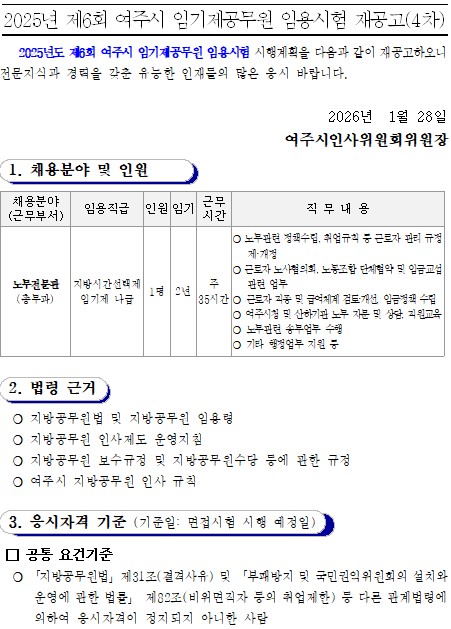 외부공지 [여주시]2025년 제6회 여주시 지방임기제공무원 임용시험 재공고(4차) 안내 2026.01.28 조회수 208 취업지원팀 share facebook twitter kakaotalk 카카오톡 앱이설치된 모바일 기기에서만공유 가능합니다. https://www.syu.ac.kr/gk2h share 복사 01-5-제6회-임용시험-재공고문_4차노무전문관_배포용.hwp (101.0 KB) 01-3-제6회-임용시험-제출서류_재공고_4차노무전문관.hwp (83.0 KB) facebook twitter kakaotalk 카카오톡 앱이설치된 모바일 기기에서만공유 가능합니다. 이전글 글이 없습니다. 다음글 [온세종학교]2026학년도 온세종학교 온라인 수업 교(강)사 인력풀 모집 안내 목록